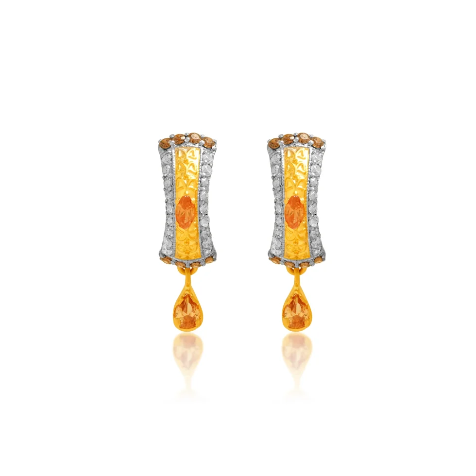 A gracefully contoured gold frame accented with shimmering stones, centered by warm amber-hued motifs. Finished with a delicate teardrop dangle, this bali brings a glowing touch of elegance and movement to every look.