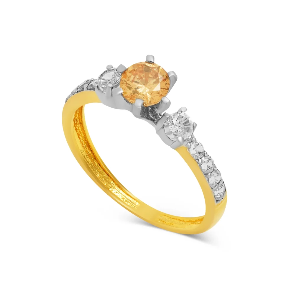A warm amber-toned center stone shines between two brilliant side stones, creating a radiant trio that symbolizes balance and harmony. The polished gold band, lined with shimmering accents, enhances the ring’s luminous charm. Elegant, refined, and full of golden warmth a timeless piece perfect for both everyday grace and special moments.