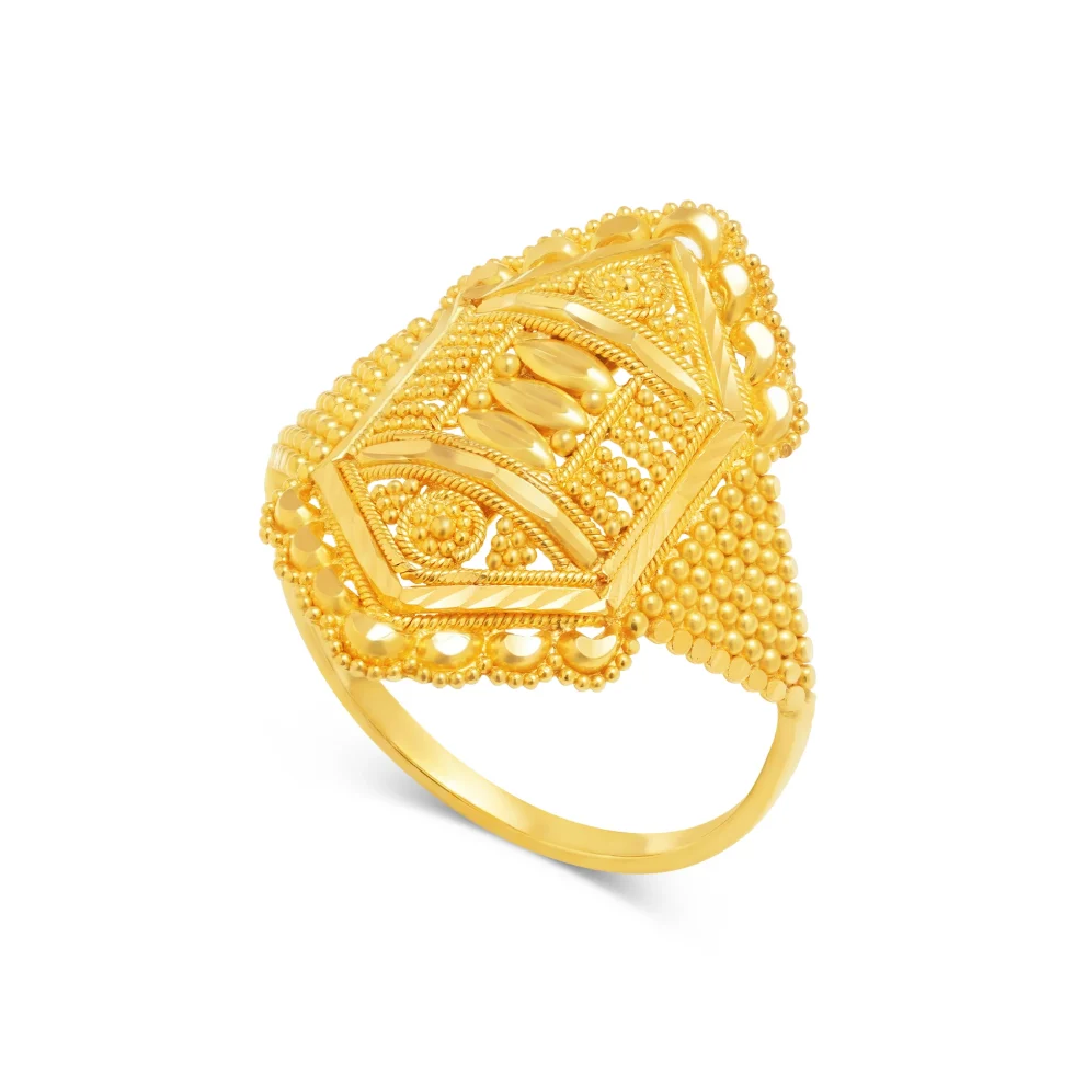 Inspired by heritage motifs, this gold ring presents a bold decorative centre framed by intricate patterns and soft curves. Its artistic detailing gives it an heirloom-quality presence.