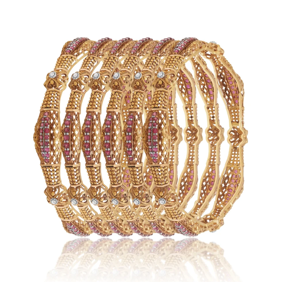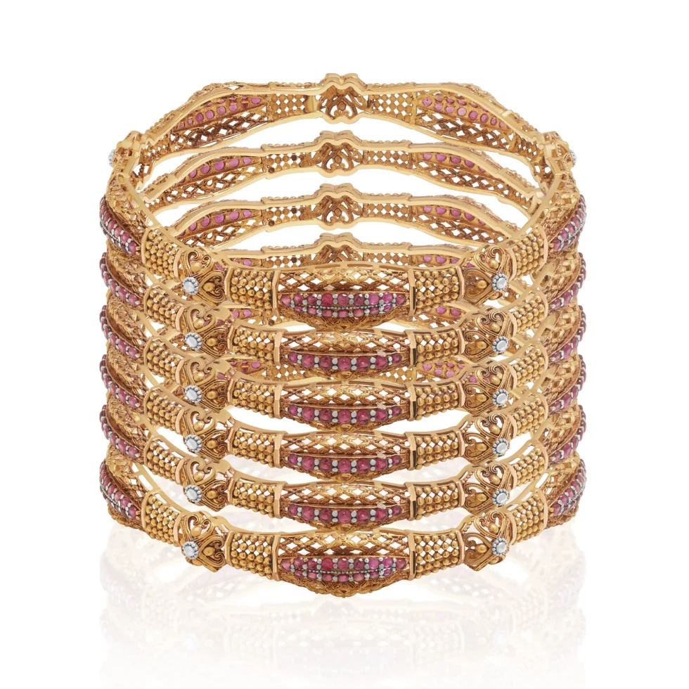These statement gold bangles combine antique-style craftsmanship with vibrant ruby detailing. The harmonious blend of texture, colour, and form delivers a regal presence suited for weddings and grand occasions.
