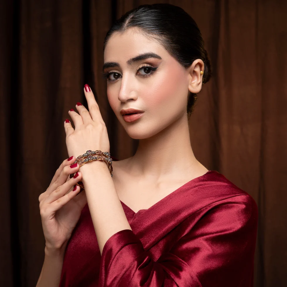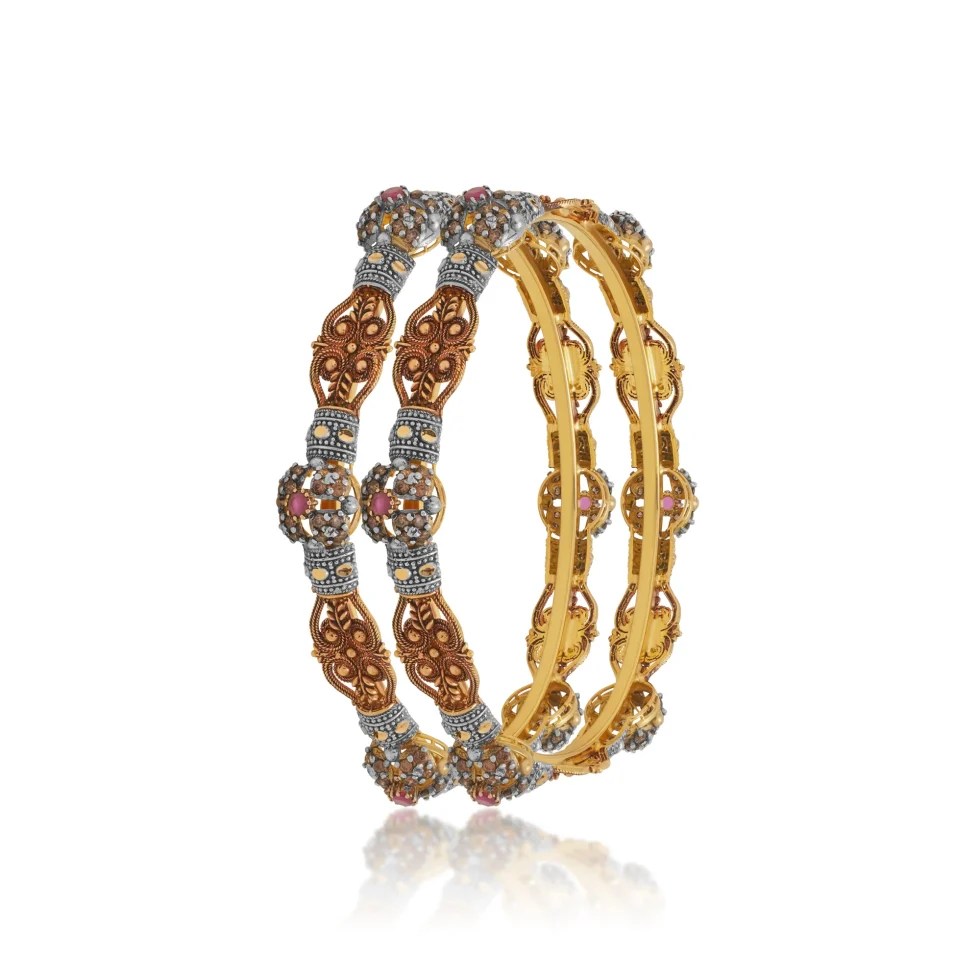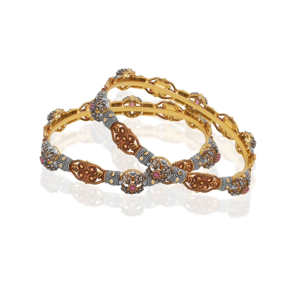 The Ardena Royal Karas embody the essence of regal craftsmanship. Each kara features intricate filigree patterns in antique gold, accentuated with silver detailing and delicate hints of ruby-hued stones. The ornate domed clusters and fine texturing reflect a timeless grandeur.