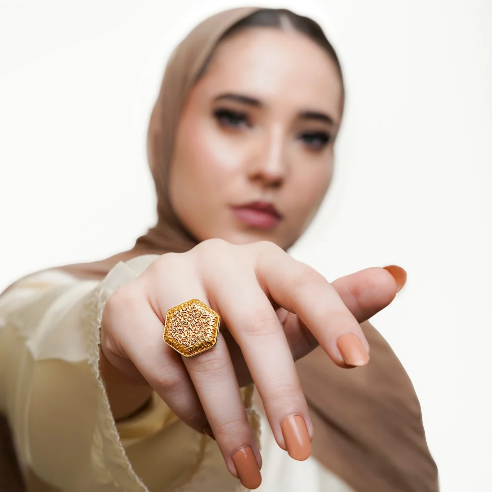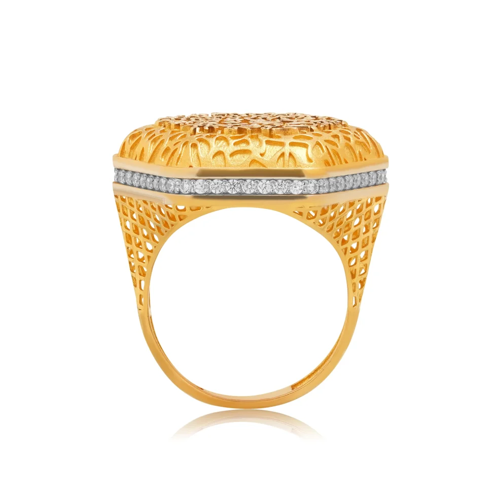 A striking hexagonal silhouette frames intricate calligraphic artistry, creating a bold yet graceful centerpiece. The raised script is surrounded by refined textural detailing, giving the ring depth and a handcrafted richness. A subtle silver-toned band encircles the crest, adding contrast and elevating the overall sophistication.