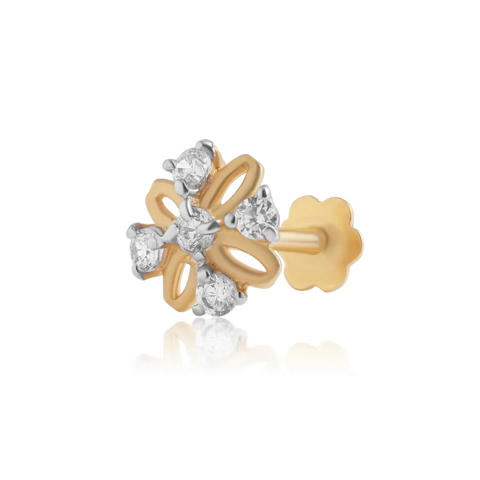 The Aurelia Bloom Nose Pin captures the essence of delicate beauty with its floral-inspired form. Crafted in lustrous gold and adorned with sparkling stones, it features petal-like openwork surrounding brilliant white accents that glisten from every angle. Its lightweight yet detailed design adds a graceful charm.