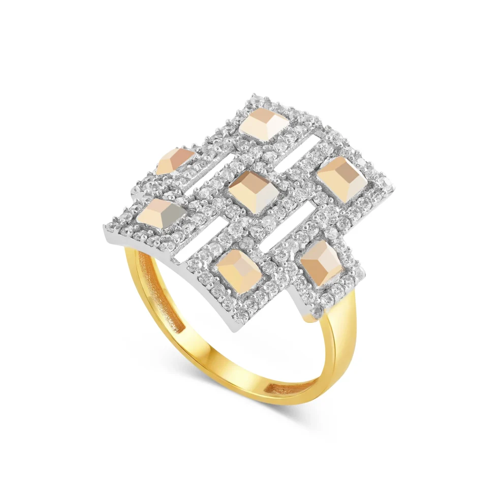 This striking gold ring features a structured grid of faceted gold elements, each framed by shimmering pavé detailing for depth and contrast. The geometric layout creates a powerful visual rhythm, while the polished gold band keeps the design balanced and wearable
