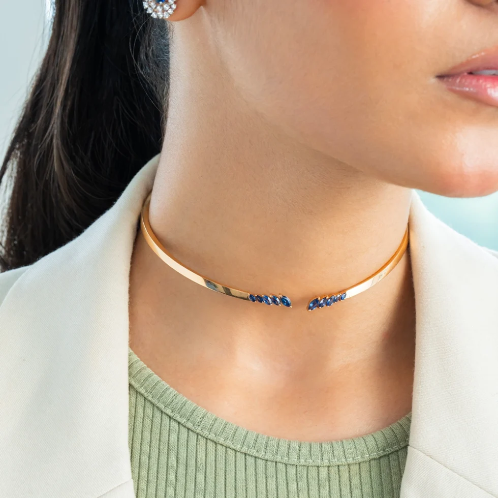 A stunning rose gold collar necklace featuring a sleek, open-ended design adorned with marquise-cut blue sapphires on each end. This modern yet elegant piece exudes sophistication and is perfect for making a bold yet refined statement at formal events or special occasions. A true blend of contemporary style and timeless allure.