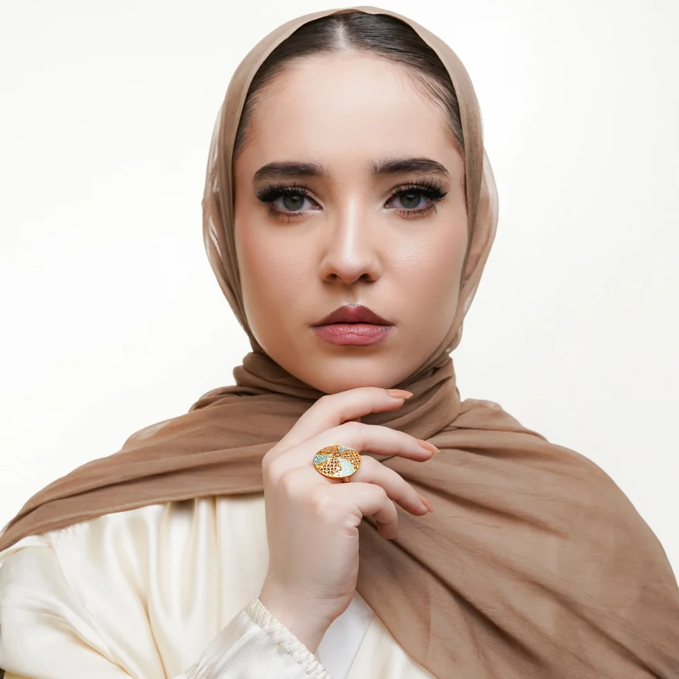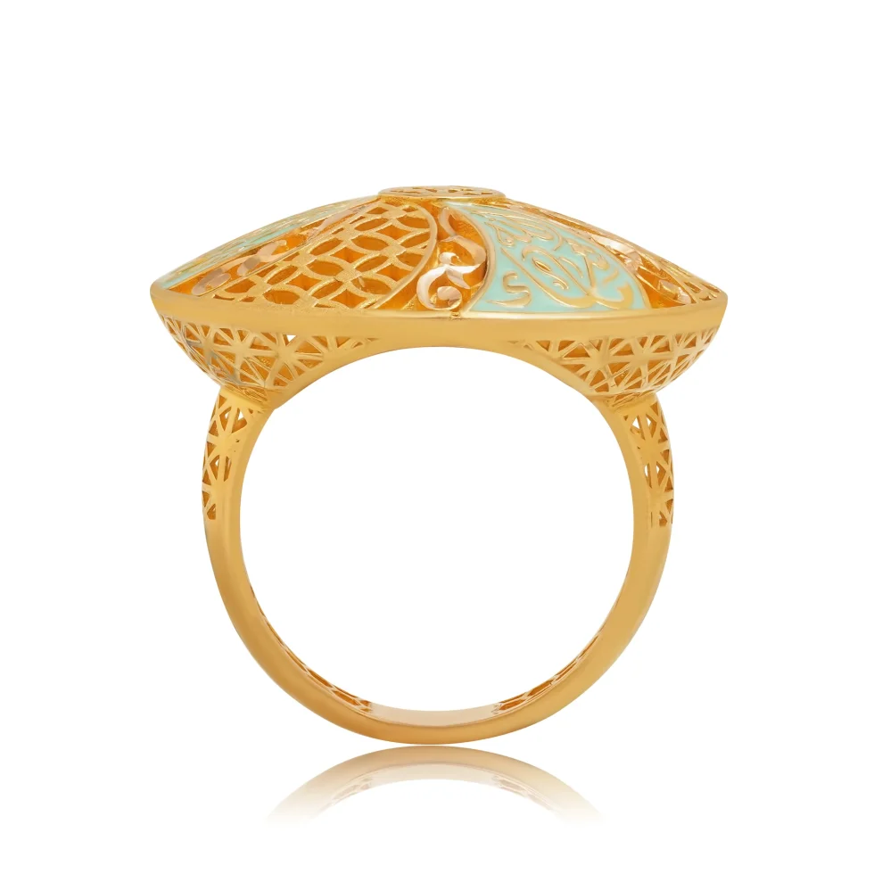 A graceful circular medallion unfolds in a petal-like swirl, blending delicate filigree mesh with turquoise enamel calligraphy. Each section is adorned with intricate detailing, creating a harmonious dance of color, script, and texture.