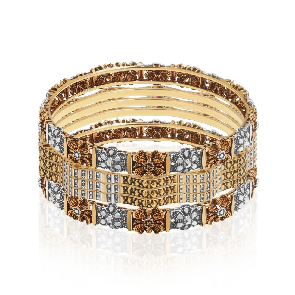 Featuring sculpted gold textures adorned with floral-inspired highlights, these bangles embody royal charm and traditional refinement. The interplay of depth, pattern, and polish makes them a striking heirloom piece for special occasions.