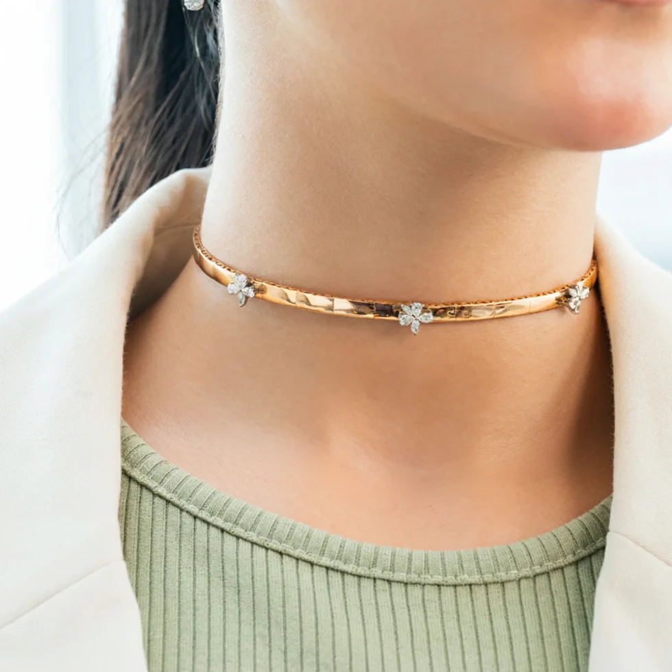 A sophisticated blend of modern design and floral elegance, the Blossom Orbit Choker showcases a gleaming gold band adorned with delicate diamond-studded floral motifs. The intricate lattice work on the reverse side adds a touch of vintage charm, making this choker a versatile piece for both formal and casual occasions. With its adjustable chain for a perfect fit, this choker is a celebration of refined craftsmanship and timeless style.