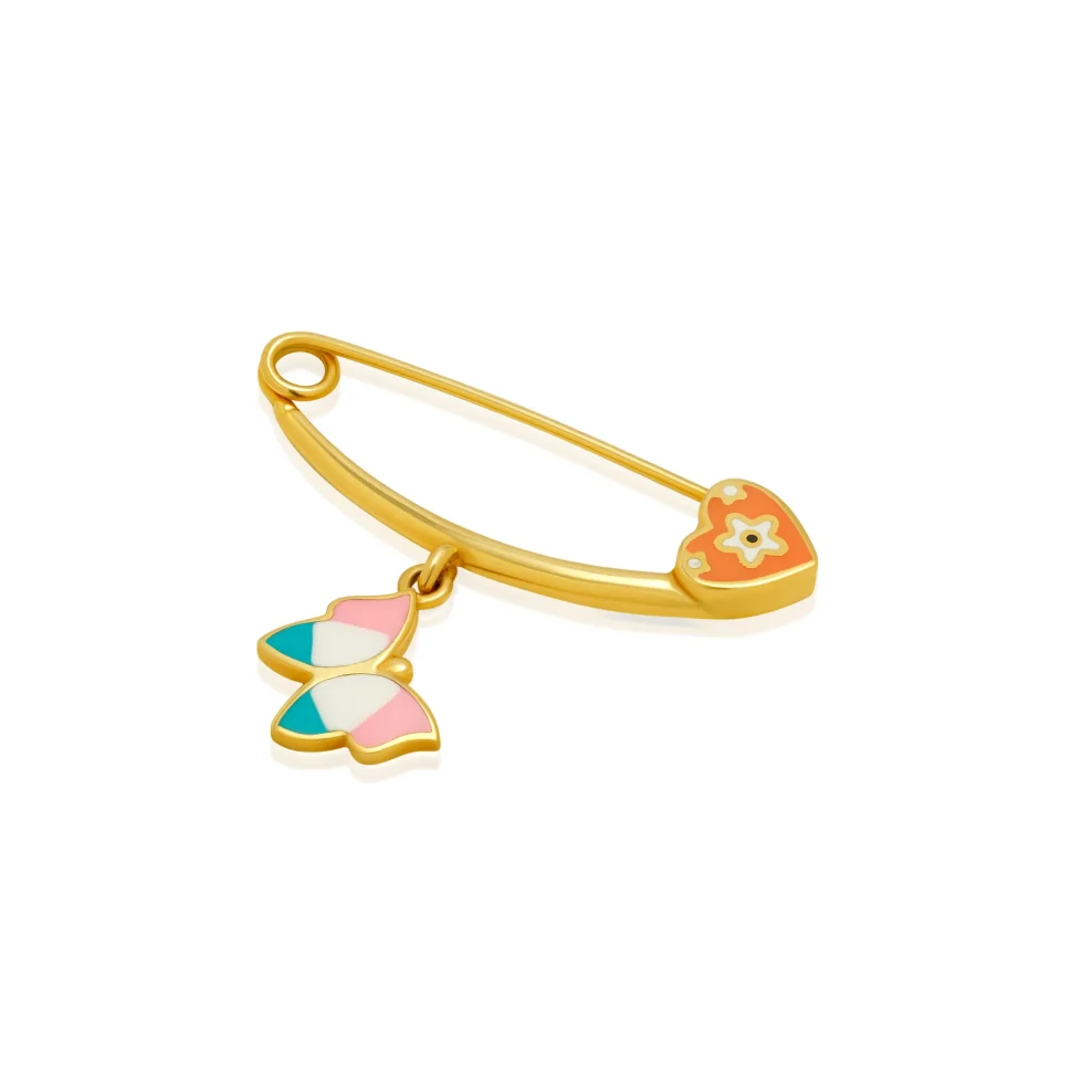 Adorned with a vibrant heart detail and a dangling butterfly charm, this gold baby pin is a beautiful expression of love, joy, and protection. The heart symbolizes warmth and affection, while the butterfly, crafted in soft pastel enamel, represents innocence, growth, and the cheerful spirit of childhood