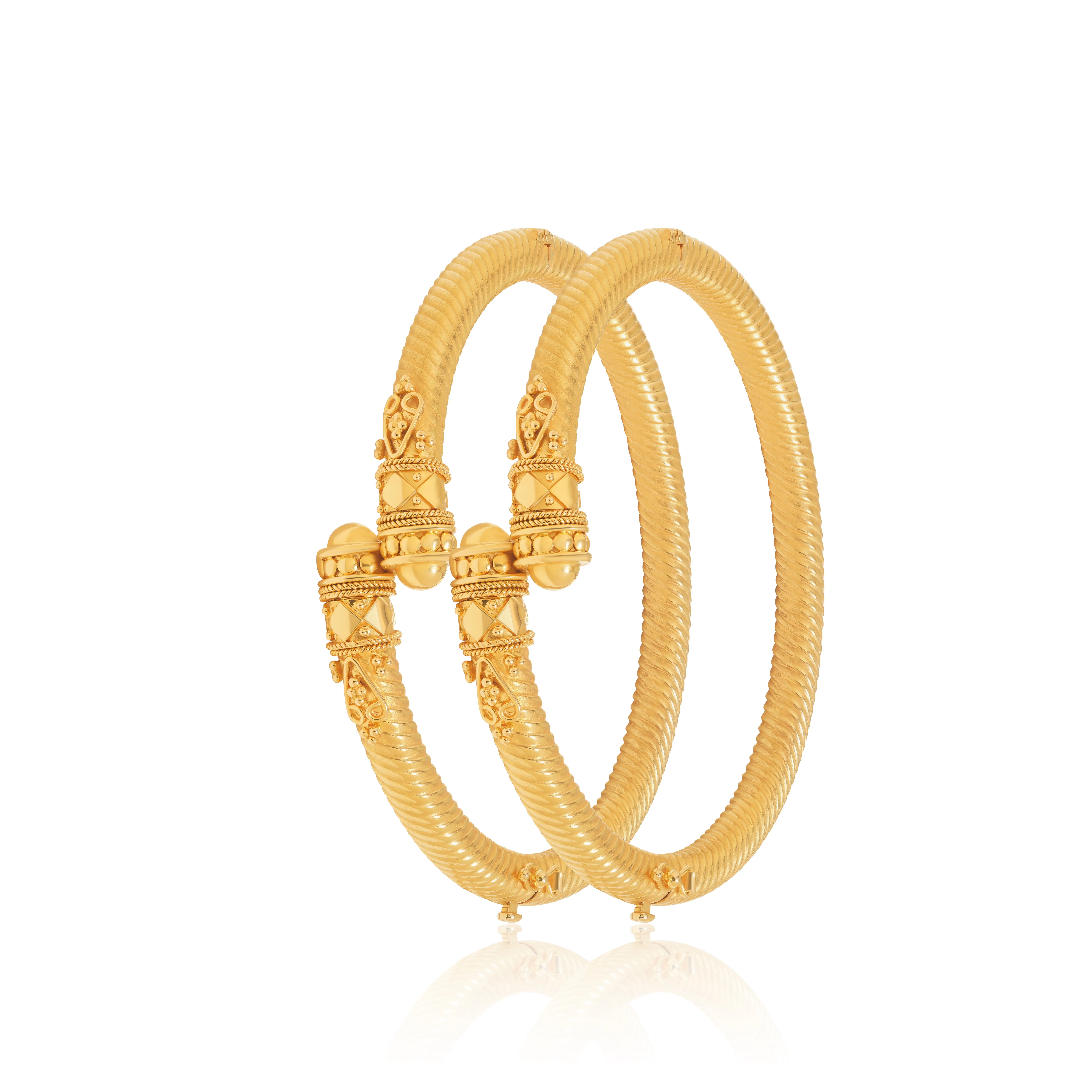 This gold kara pair features a harmonious ribbed structure complemented by delicately detailed closures. Designed for comfort and longevity, it embodies simplicity rooted in tradition.