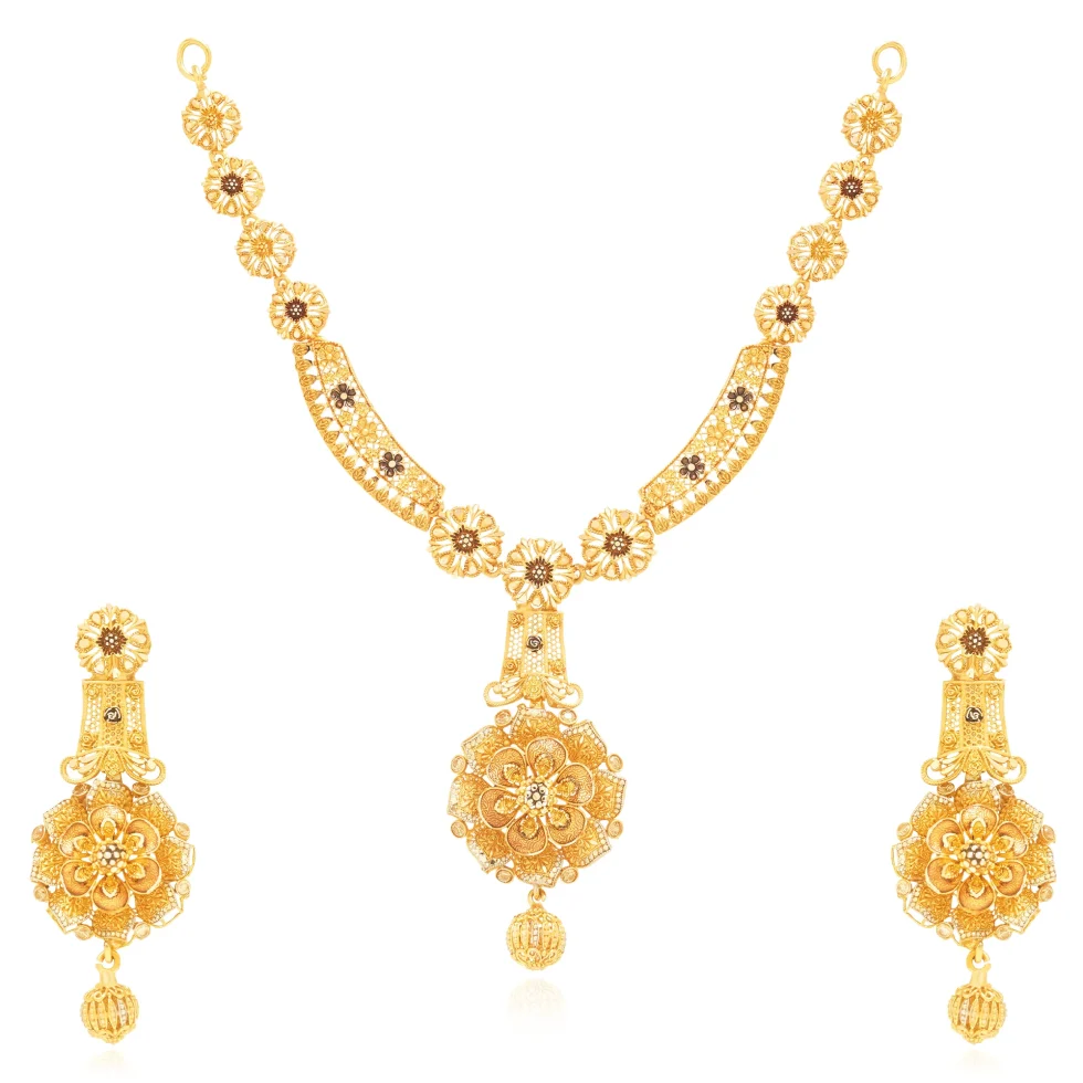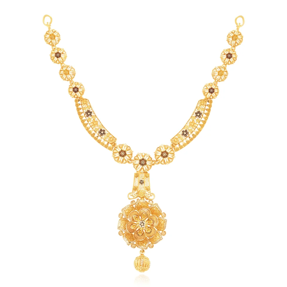 Designed with intricate floral motifs and refined gold detailing, this necklace set reflects timeless heritage artistry. The structured necklace leads to an elaborate pendant with a soft gold drop, while the coordinating earrings complete a balanced and elegant ensemble.