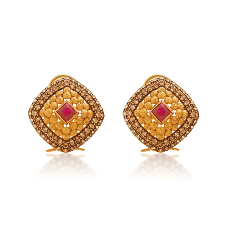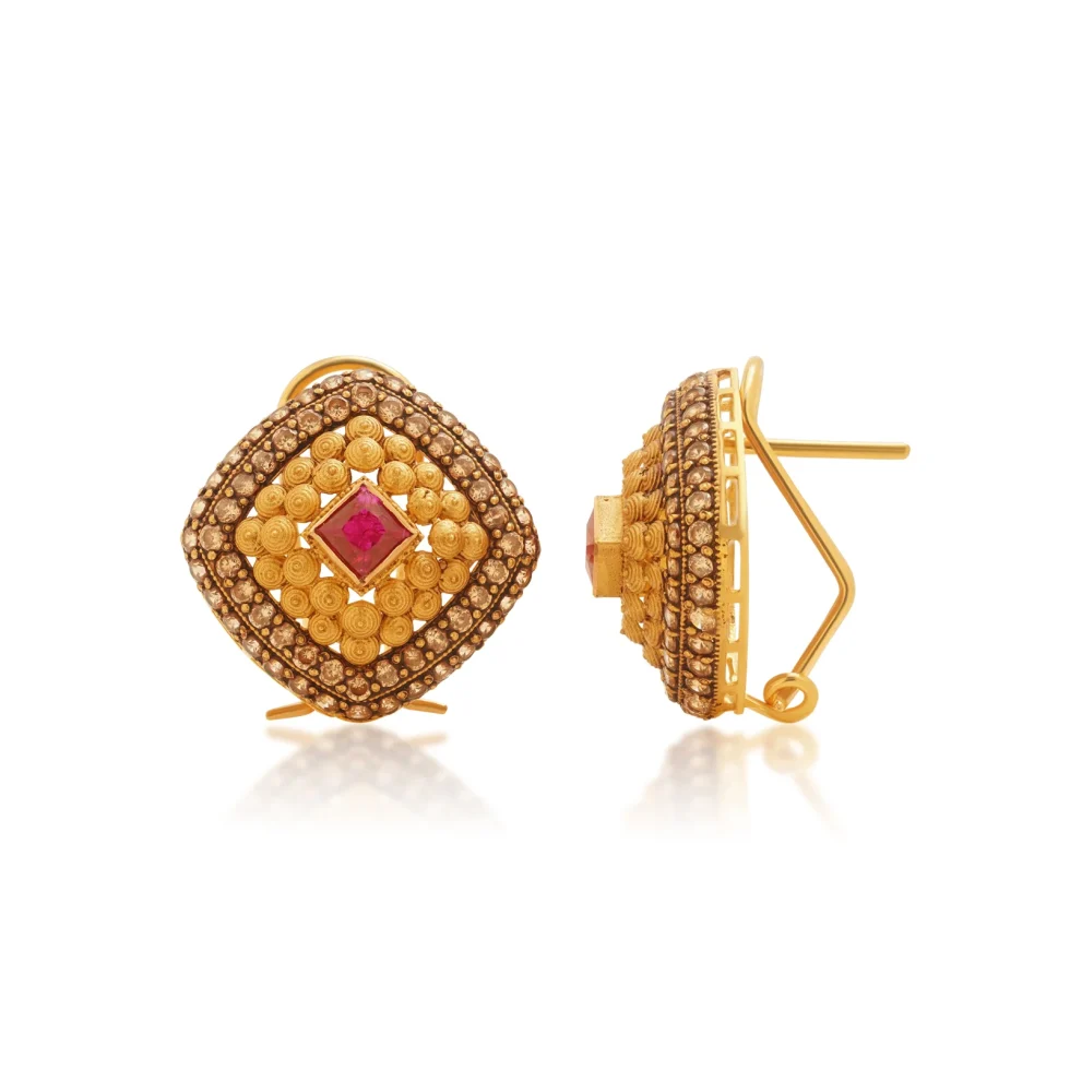 Featuring a striking ruby surrounded by concentric patterns of gold coils and micro-beads, this design echoes the beauty of handcrafted mosaic artistry. Bold, traditional, and full of depth.