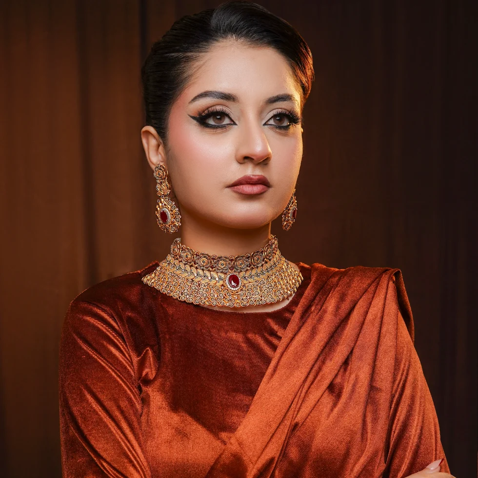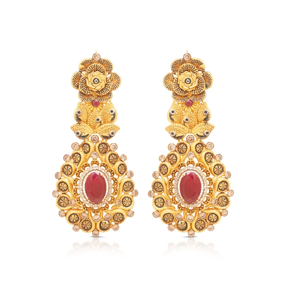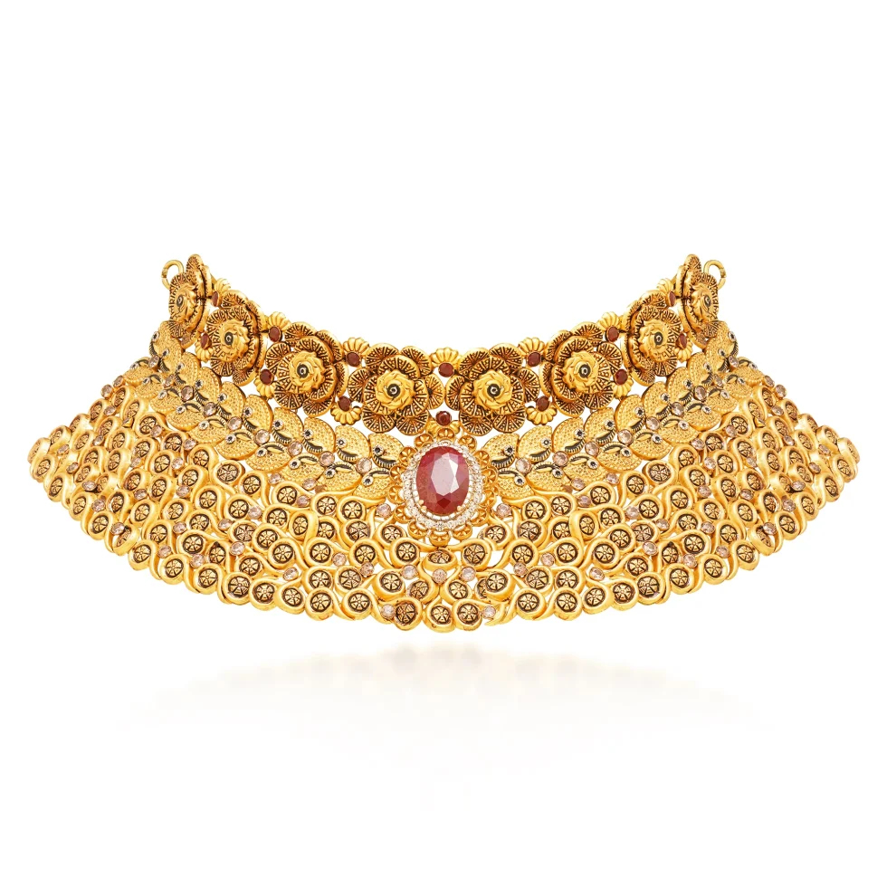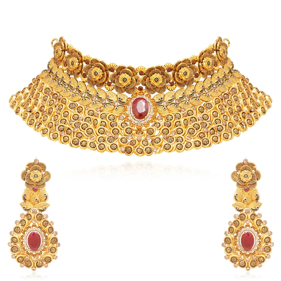 With layered floral engravings and an oval ruby centre, this set blends artistry and colour in a statement of pure traditional grandeur. Each element is meticulously sculpted, from the intricate rosette clusters across the neckline to the cascading lattice of circular motifs that create depth and dimension.