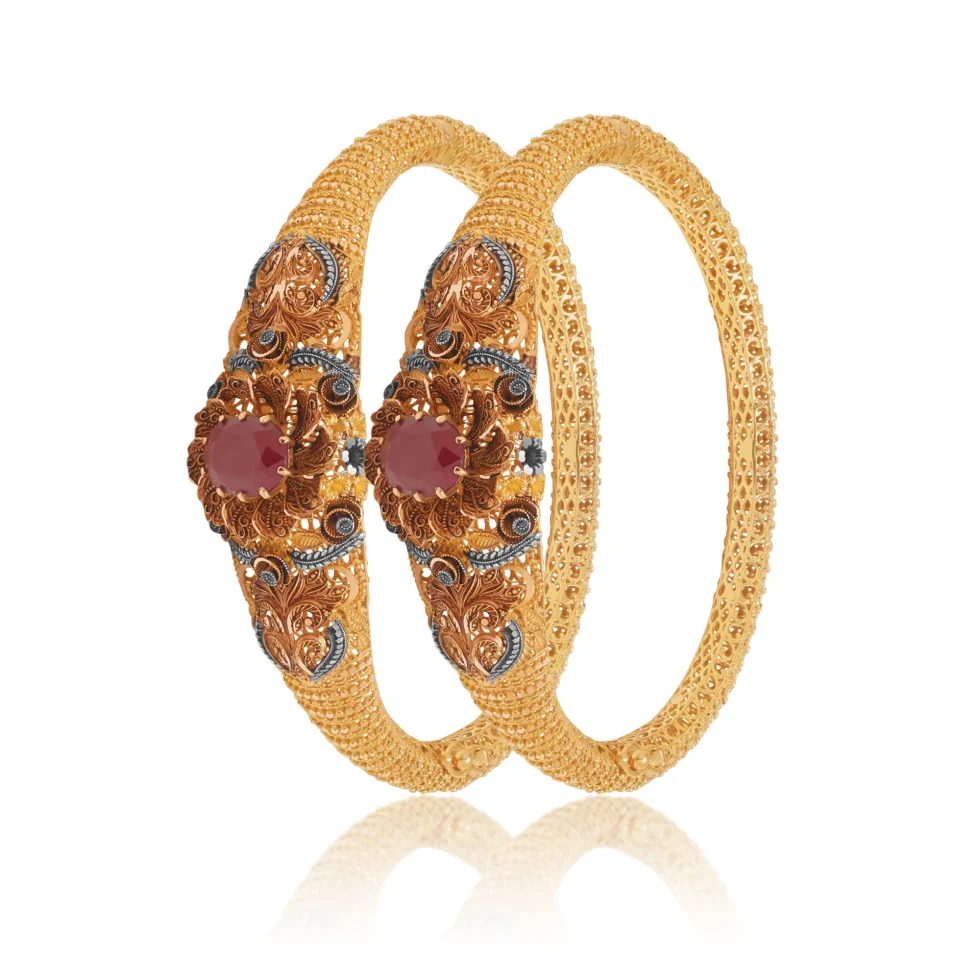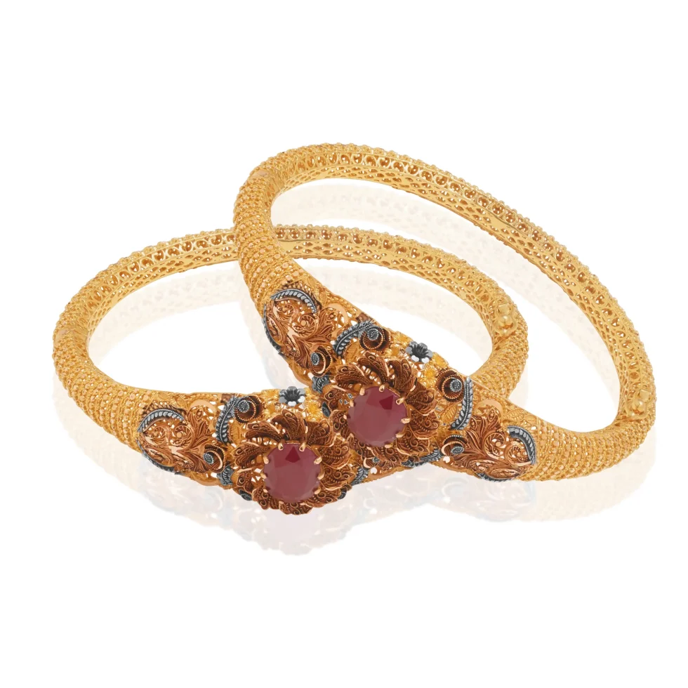 A grand kara pair enriched with intricate filigree work and a deep crimson centerpiece. The sculpted motifs, textured detailing, and dual-tone accents come together to create an opulent traditional masterpiece.