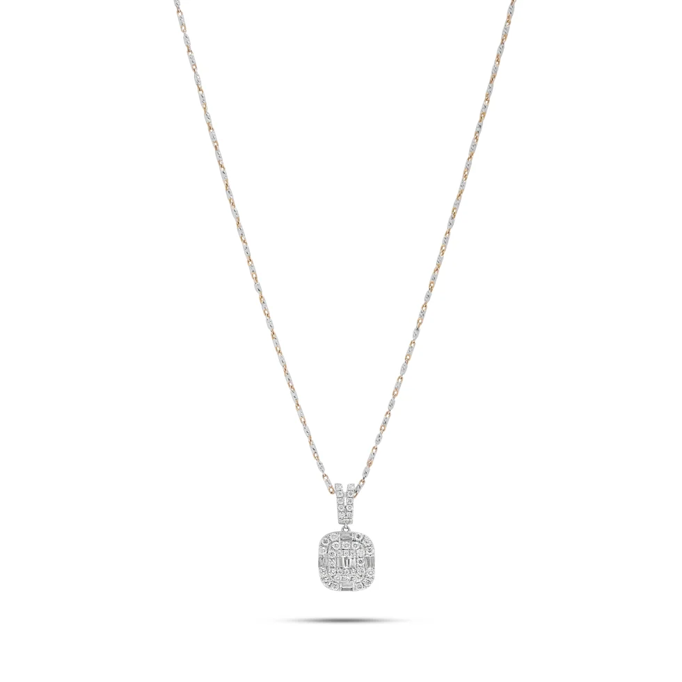 A refined cushion-shaped diamond pendant featuring a structured baguette cluster framed by finely set round diamonds. Designed for balanced brilliance, it offers timeless elegance with a modern finish.