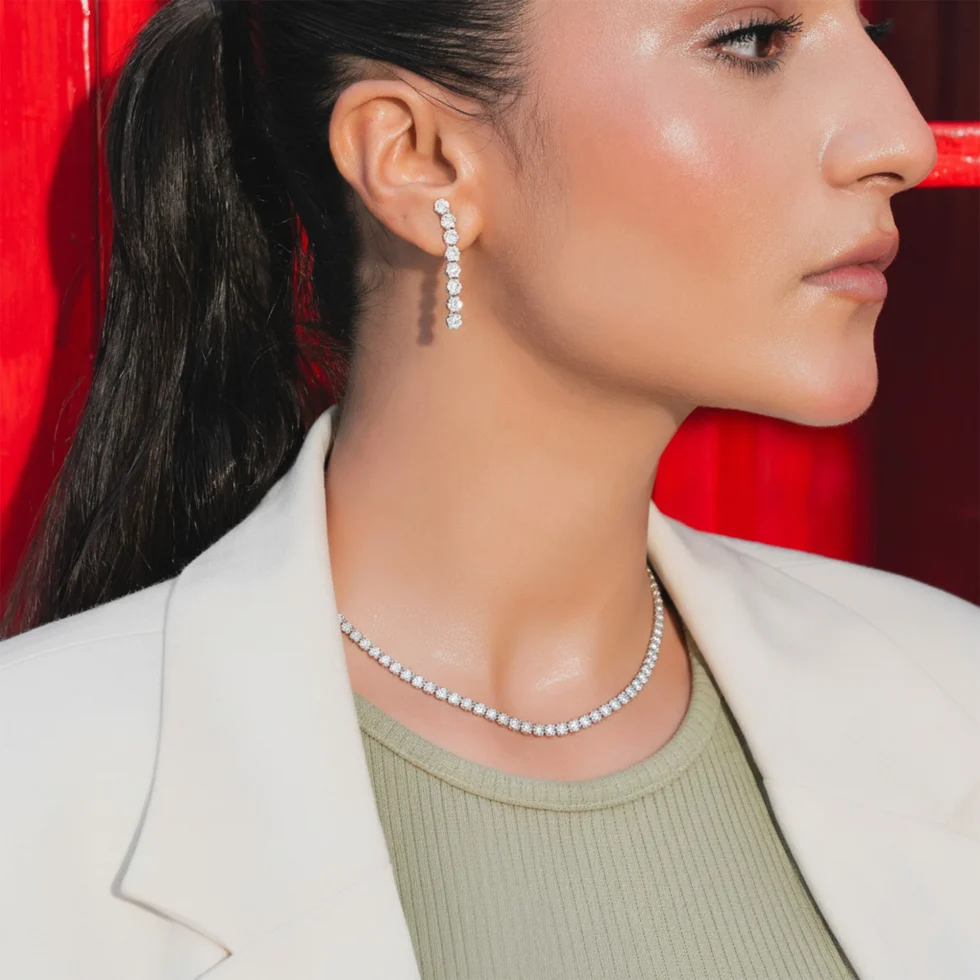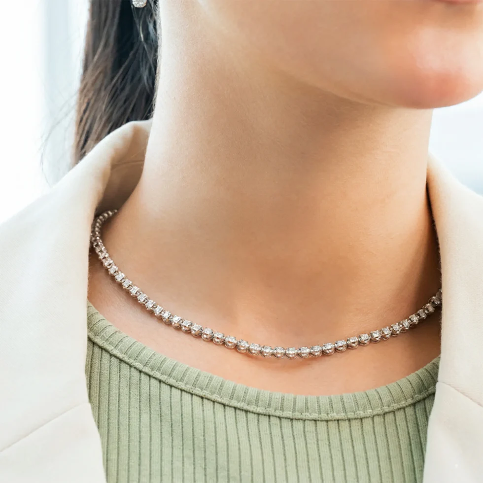 The Eterna Diamond Line Necklace embodies timeless sophistication with its seamless row of luminous diamonds, each set to capture light from every angle. Crafted with precision, the delicate yet striking design rests gracefully along the neckline, making it the perfect statement of elegance