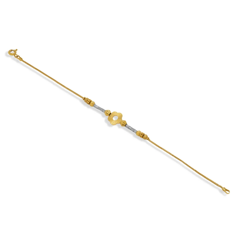 A modern two-tone bracelet featuring a minimal floral centerpiece paired with textured silver-tone bars and gold bead accents. Its sleek, lightweight design makes it perfect for everyday wear, adding a soft touch of elegance with a contemporary twist.