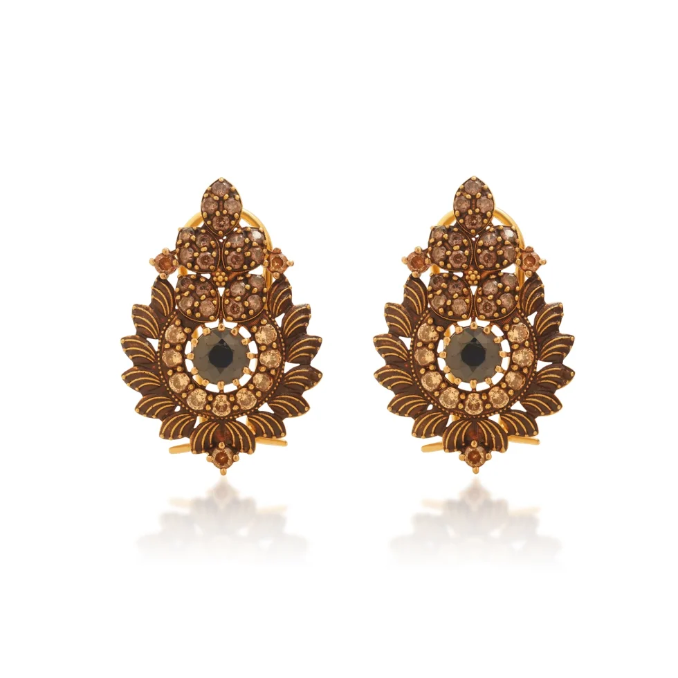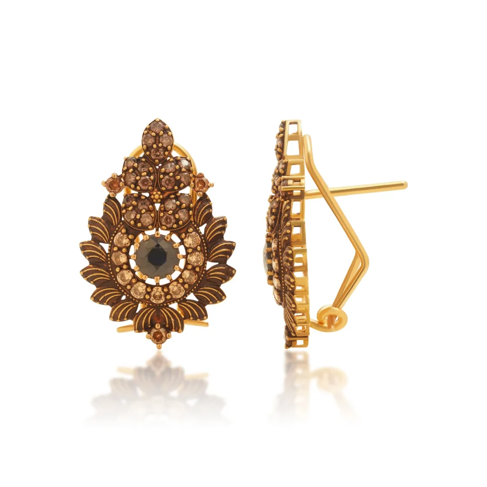 A graceful floral silhouette unfolds around a rich black stone, enhanced by ornate antique-gold engravings. The contrast of dark and gold tones adds depth, making it an expressive heritage statement piece.