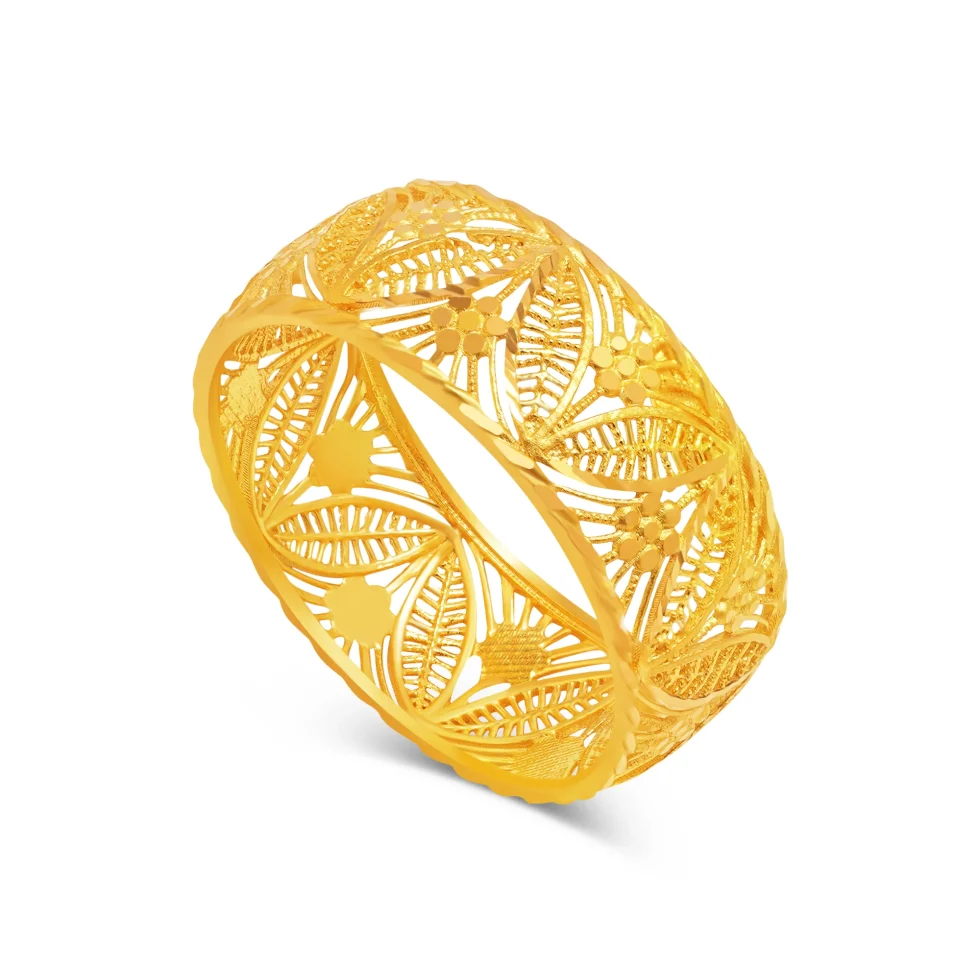 A beautifully crafted filigree ring featuring delicate leaf-woven patterns and radiant floral accents. The openwork detailing allows light to flow through the design, creating a soft, airy glow around the finger. Its wide silhouette offers a statement look while maintaining the timeless charm of traditional gold craftsmanship.