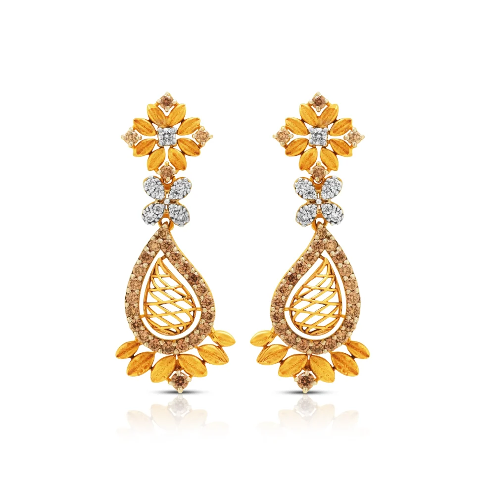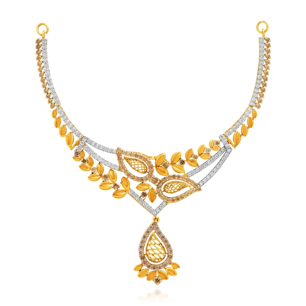 A graceful interplay of sculpted leaves, shimmering dual-tone gold, and airy lattice motifs defines this exquisite necklace set. Branch-like curves sweep elegantly across the neckline, leading to pear-shaped drops framed with delicate petals. The matching earrings mirror the intricate leaf work, creating a harmonious and feminine silhouette.