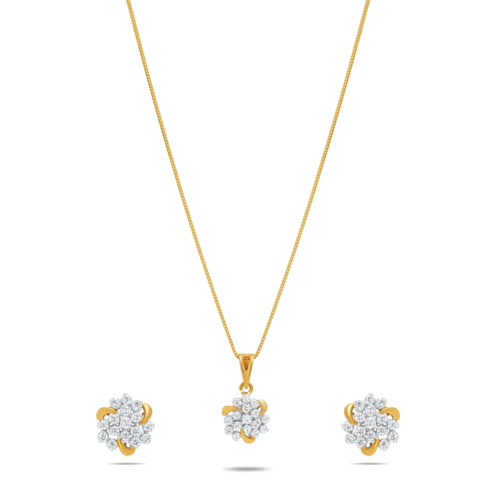 The Elenor Twirl Set captures the elegance of motion in gold and sparkle. Its swirling golden arcs embrace a cluster of luminous stones, forming a blooming spiral that radiates harmony and grace. Designed to reflect fluid beauty, this set transitions effortlessly from day to evening, making it a timeless choice for women.