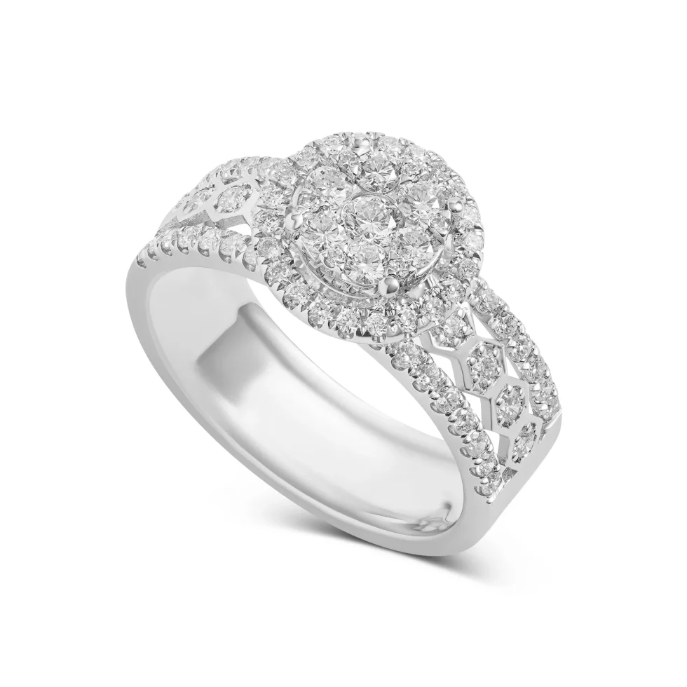 A statement of poise and precision, the Elowen Grace Ring glows with a layered diamond cluster that evokes natural radiance. Its sculpted band pattern creates depth and reflection, merging heritage craftsmanship with modern refinement.