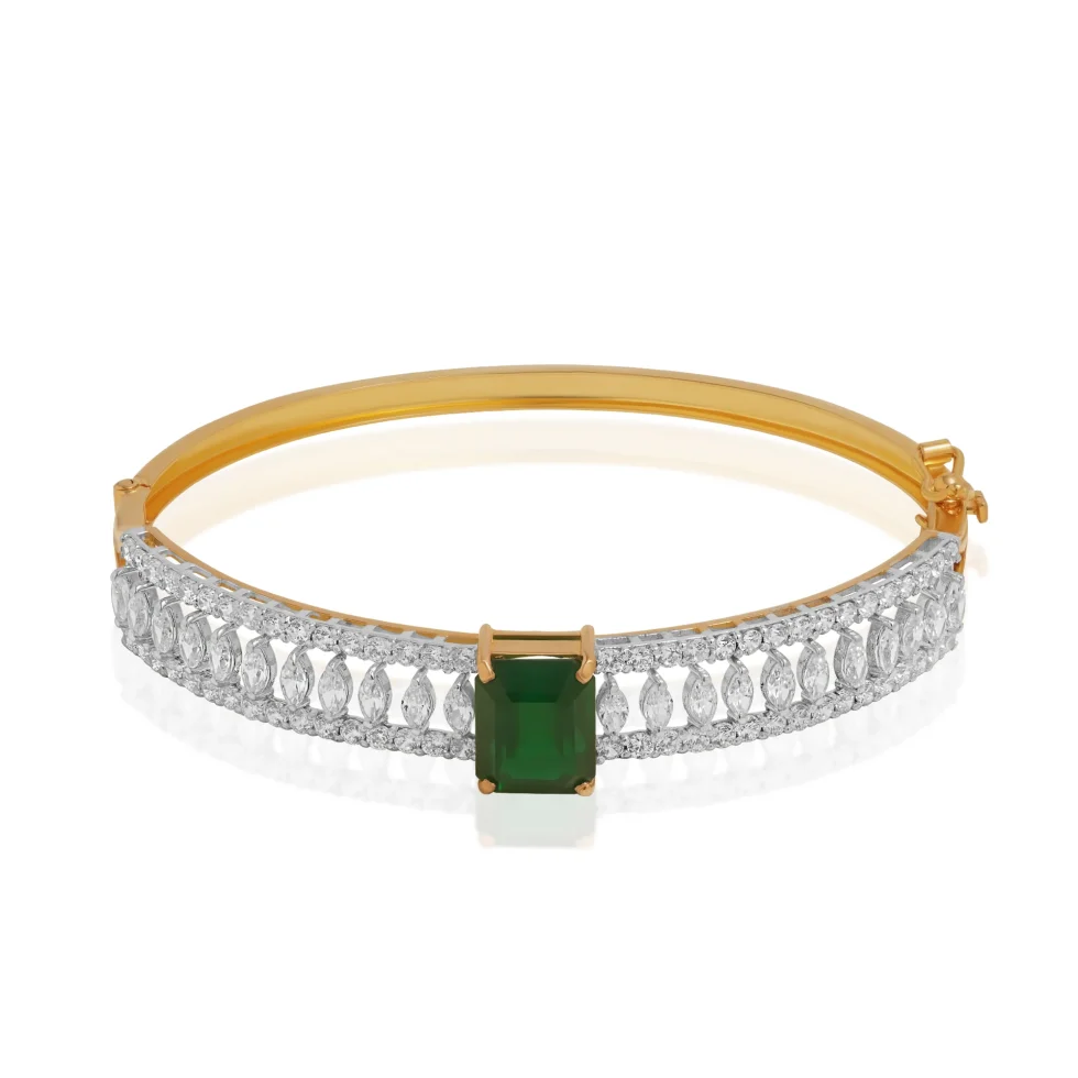 The Zareen Emerald Arc Kara highlights a bold emerald centerpiece framed by an elegant sequence of oval stones accents. The open, luminous design enhances light reflection while maintaining a sleek silhouette. Perfect for weddings, celebrations, and heirloom-inspired styling, this kara reflects meticulous craftsmanship and graceful beauty.