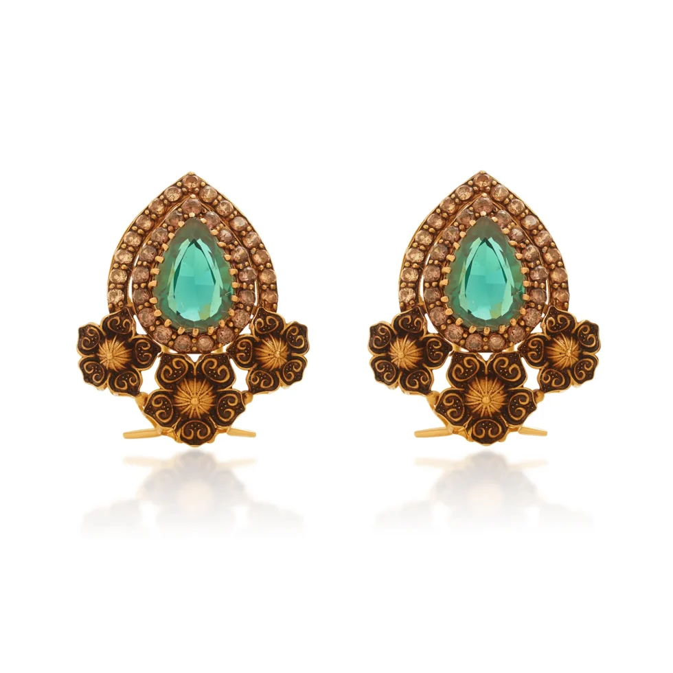 A teardrop-shaped emerald-toned stone sits at the heart of this ornate design, framed by shimmering antique-finish stones. Below it, a cluster of intricately carved floral motifs adds warmth, depth, and rich traditional character.