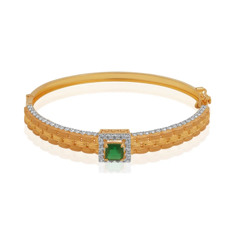 The Emerald Frame Kara highlights a vibrant emerald enclosed within a accented square setting. The intricately patterned gold band reflects skilled artistry, offering texture and brilliance in perfect harmony.