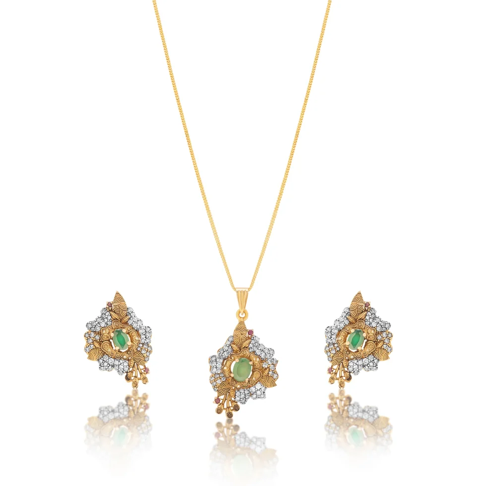 A striking emerald-toned centerpiece surrounded by shimmering white clusters and fine handcrafted gold textures. The design blends crisp brightness with warm gold, creating a refreshing, high-detail look perfect for festive and semi-formal wear.