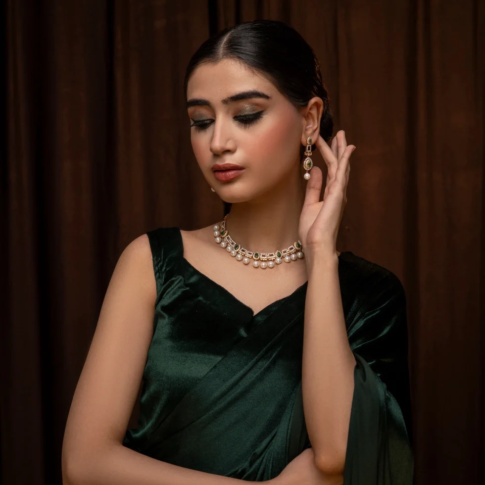A harmonious blend of glowing pearls and green gemstone drops, this design flows like a soft musical rhythm—graceful, fluid, and beautifully composed. The geometric links introduce a refined contemporary character, while the cascading pearl fringe adds timeless femininity.