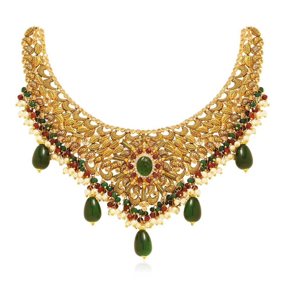 A grand heirloom-style necklace set meticulously crafted with intricate filigree, ornate floral motifs, and lush leaf detailing. The crescent silhouette glows with artisanal texture, leading to a majestic central medallion crowned with a deep green carved stone that adds richness and royal depth.