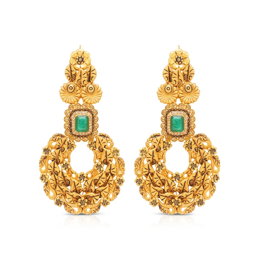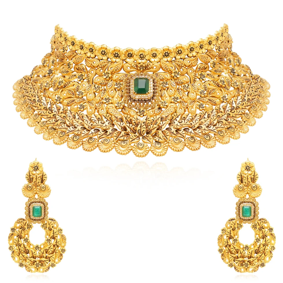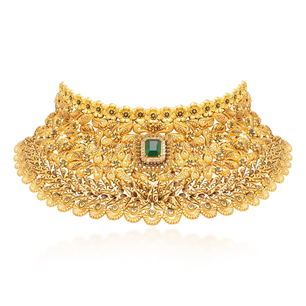 An opulent gold choker crowned with a vivid emerald centerpiece. Its intricate floral and leaf filigree creates a rich, sculpted texture, offering a truly regal presence for the modern bride.