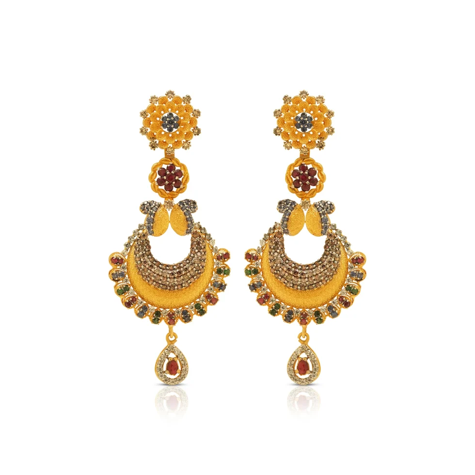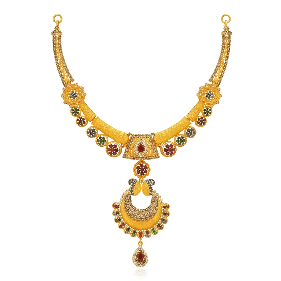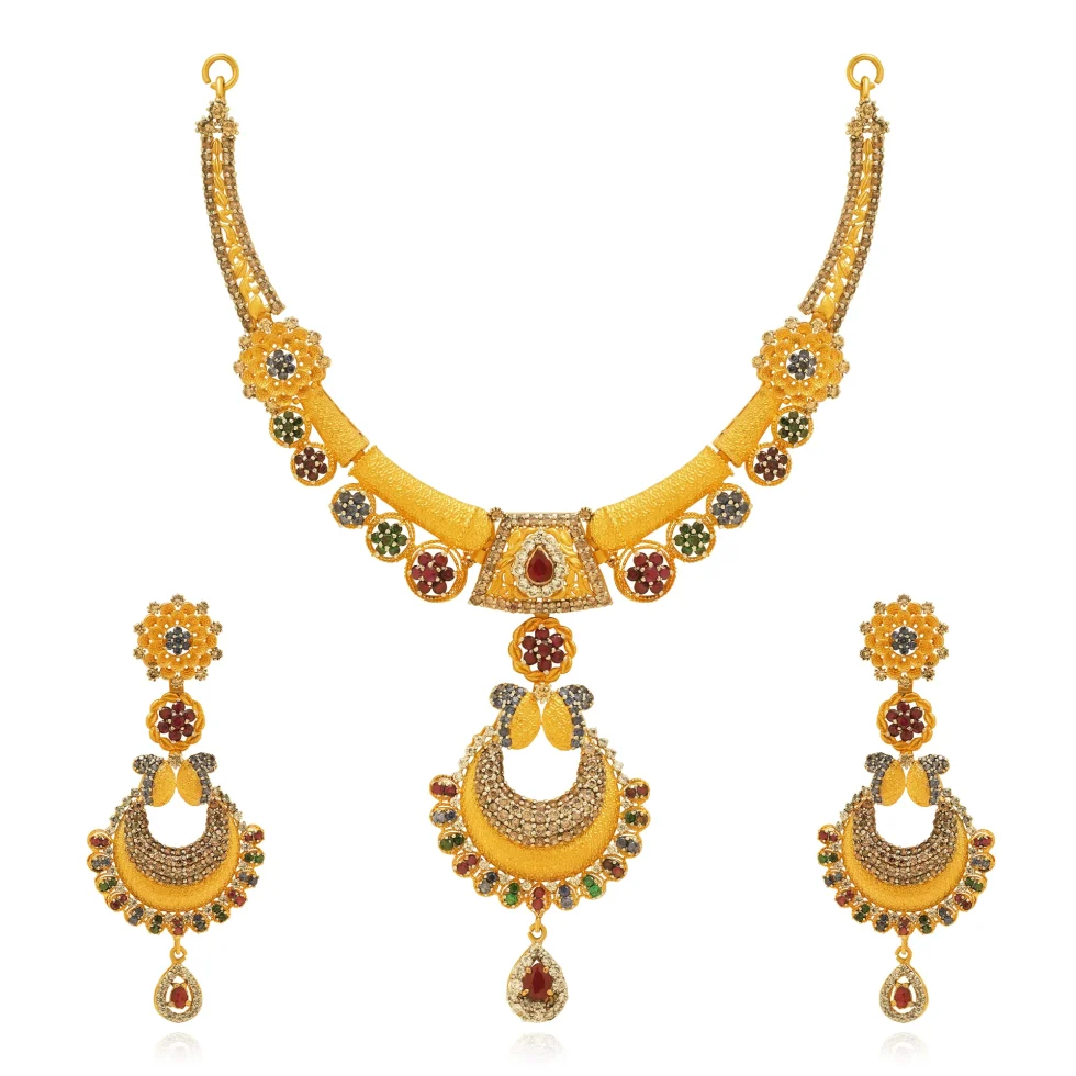 Designed with luminous stones and ornate gold work, this set glows like a crown touched by light. The tiered crescent centerpiece is enriched with intricate textures, while the vibrant borders of multicolored stones add a festive brilliance. Together, they create a look of traditional grandeur that commands attention at every celebration..
