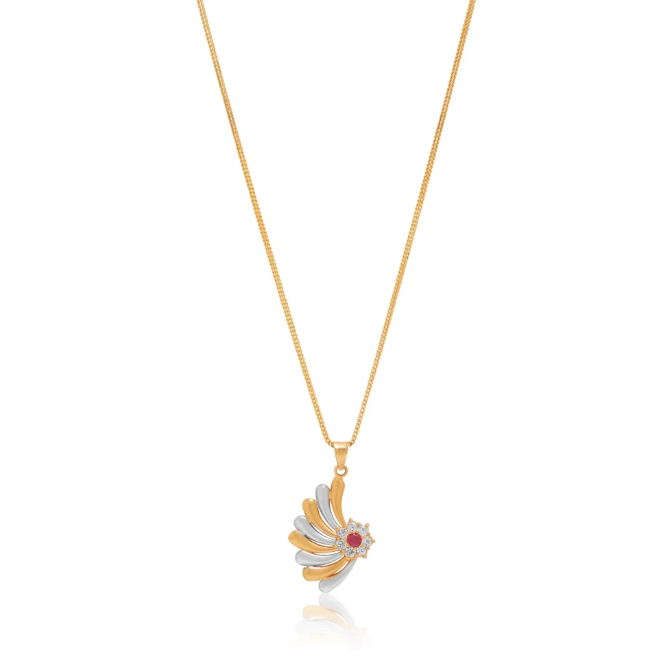 Flowers have long symbolised beauty and renewal. This pendant reimagines that symbolism through a flowing swirl of sculpted petals in two-tone gold, centered with a luminous ruby. A delicate design crafted to shine with enduring elegance.