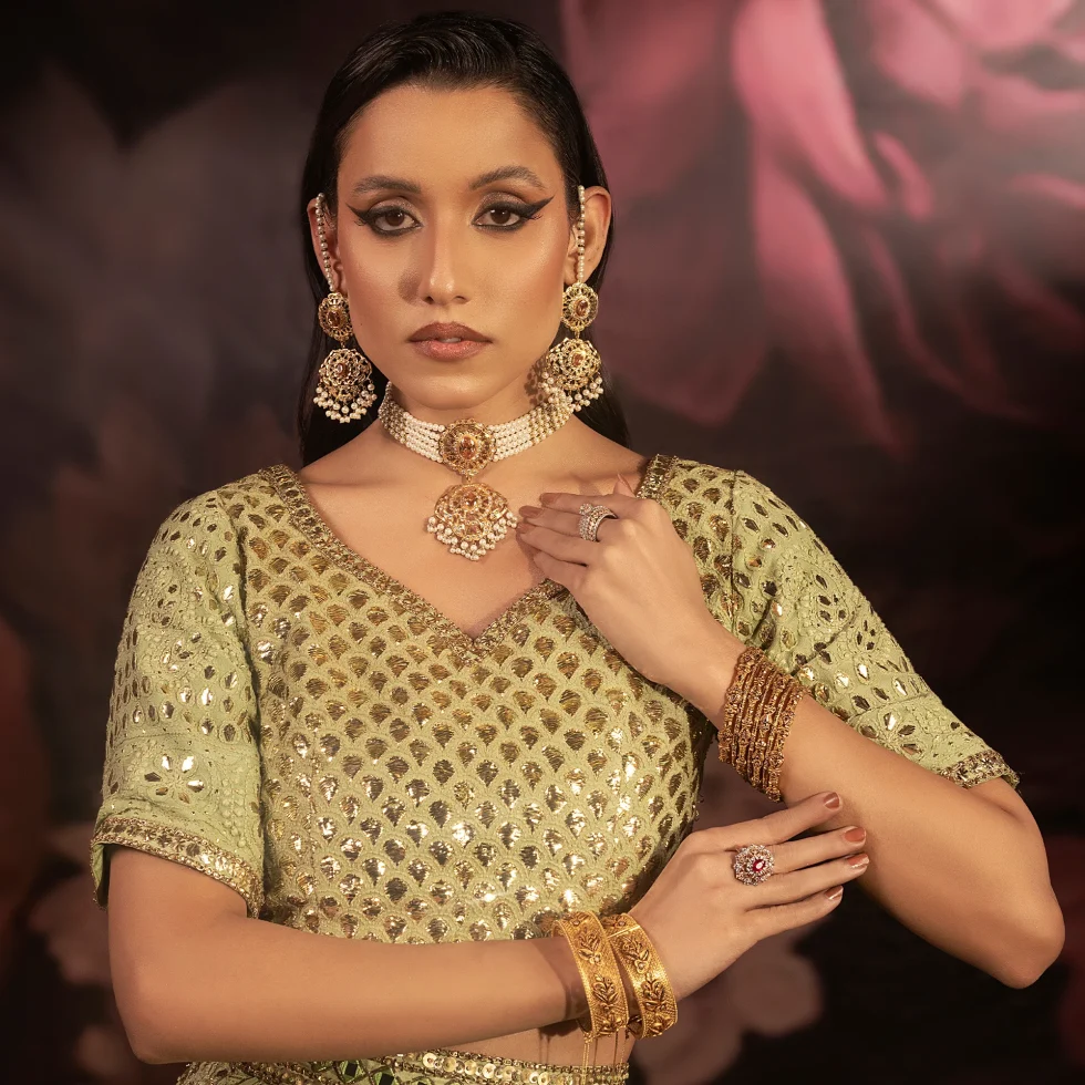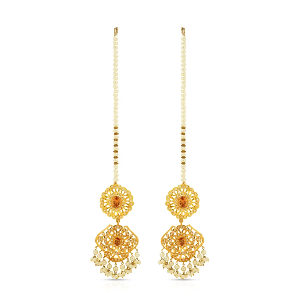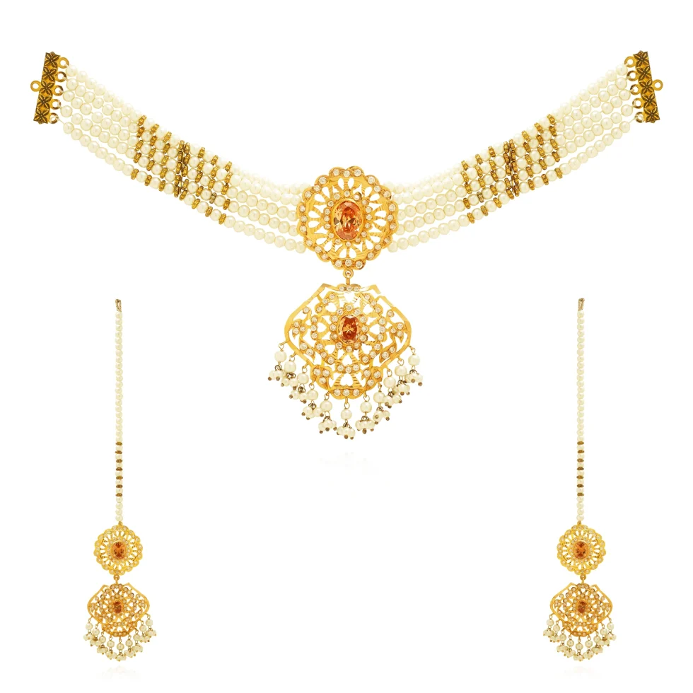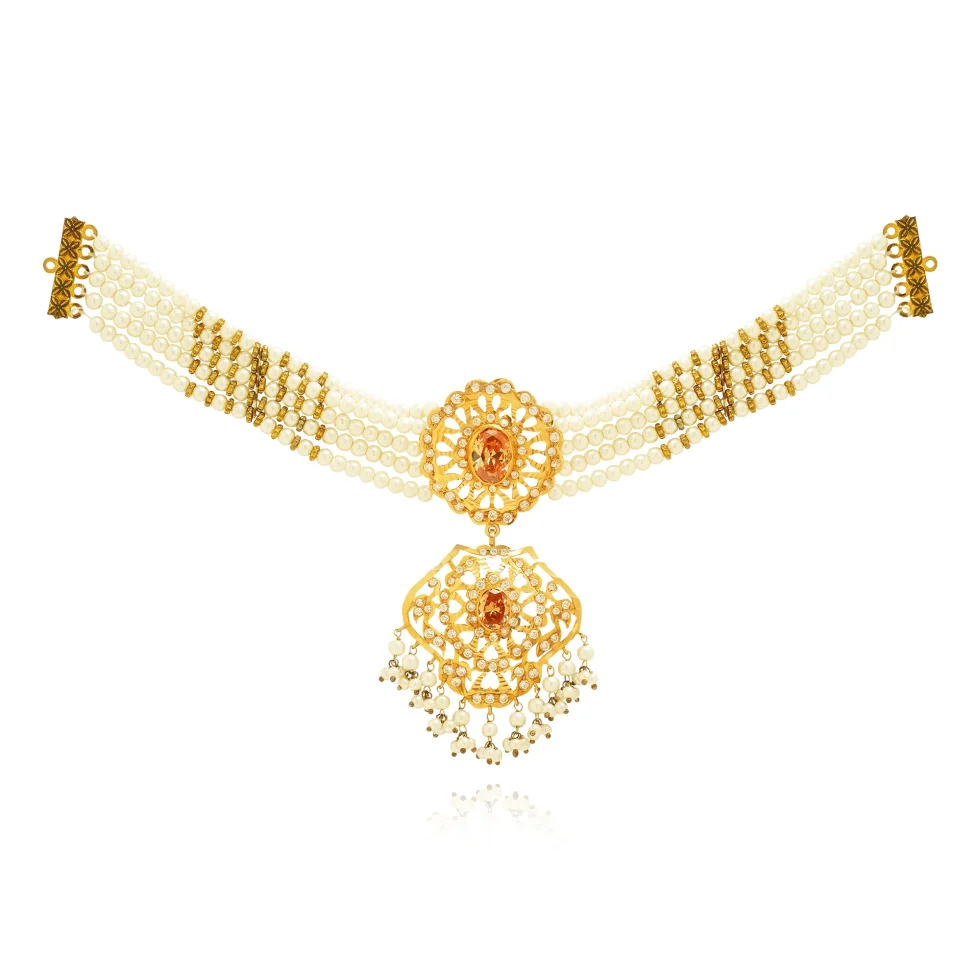 A captivating bridal set featuring intricately designed gold and pearl accents. The choker-style necklace is adorned with delicate rows of pearls and a statement gold medallion, complemented by matching cascading earrings. The central motifs sparkle with a regal charm, making this set a perfect choice for a bride seeking elegance with a touch of tradition.