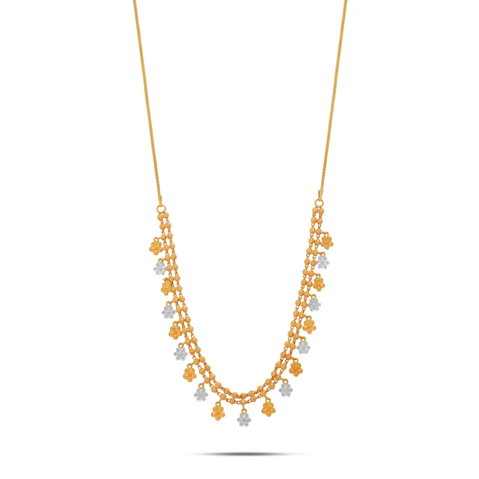 Featuring dual-tone flower motifs suspended along a beautifully crafted bead network, this chain offers a rhythmic, elegant shimmer. Lightweight yet expressive, it adds a touch of refined charm to everyday wear.