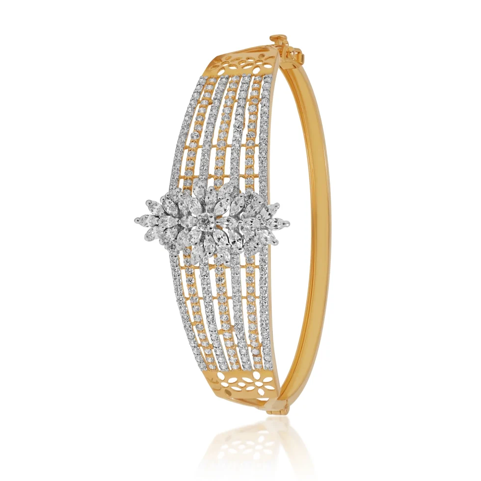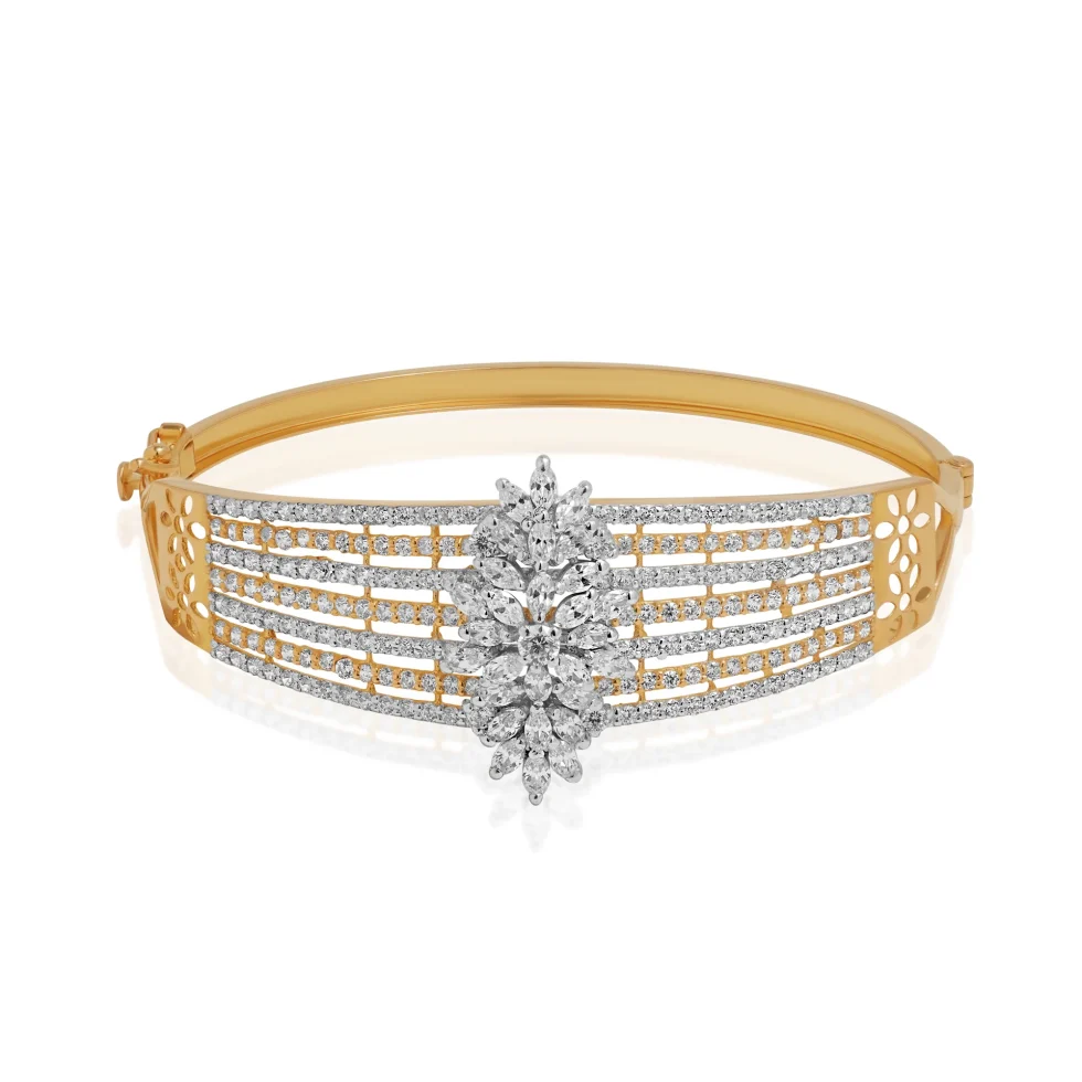 The Floral Crest Kara showcases a beautifully composed diamond flower centerpiece set against parallel rows of fine diamond accents. Crafted in rich gold, the design combines traditional elegance with modern symmetry.