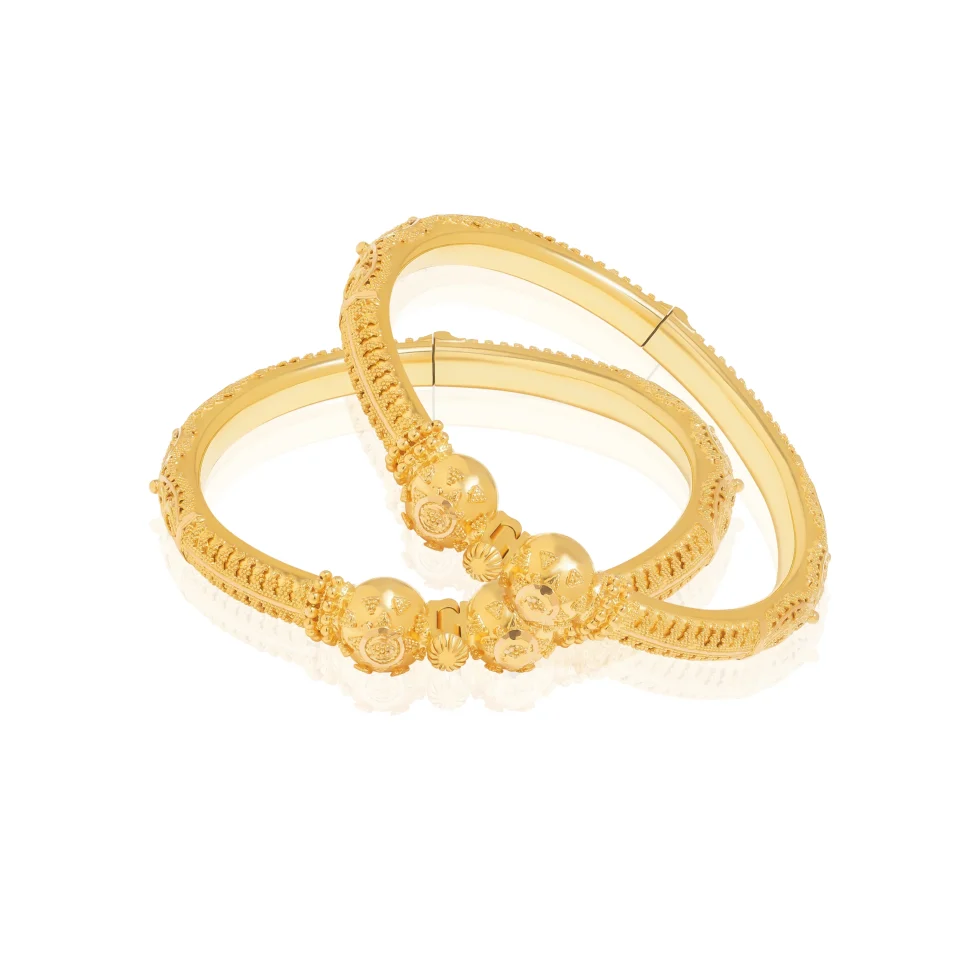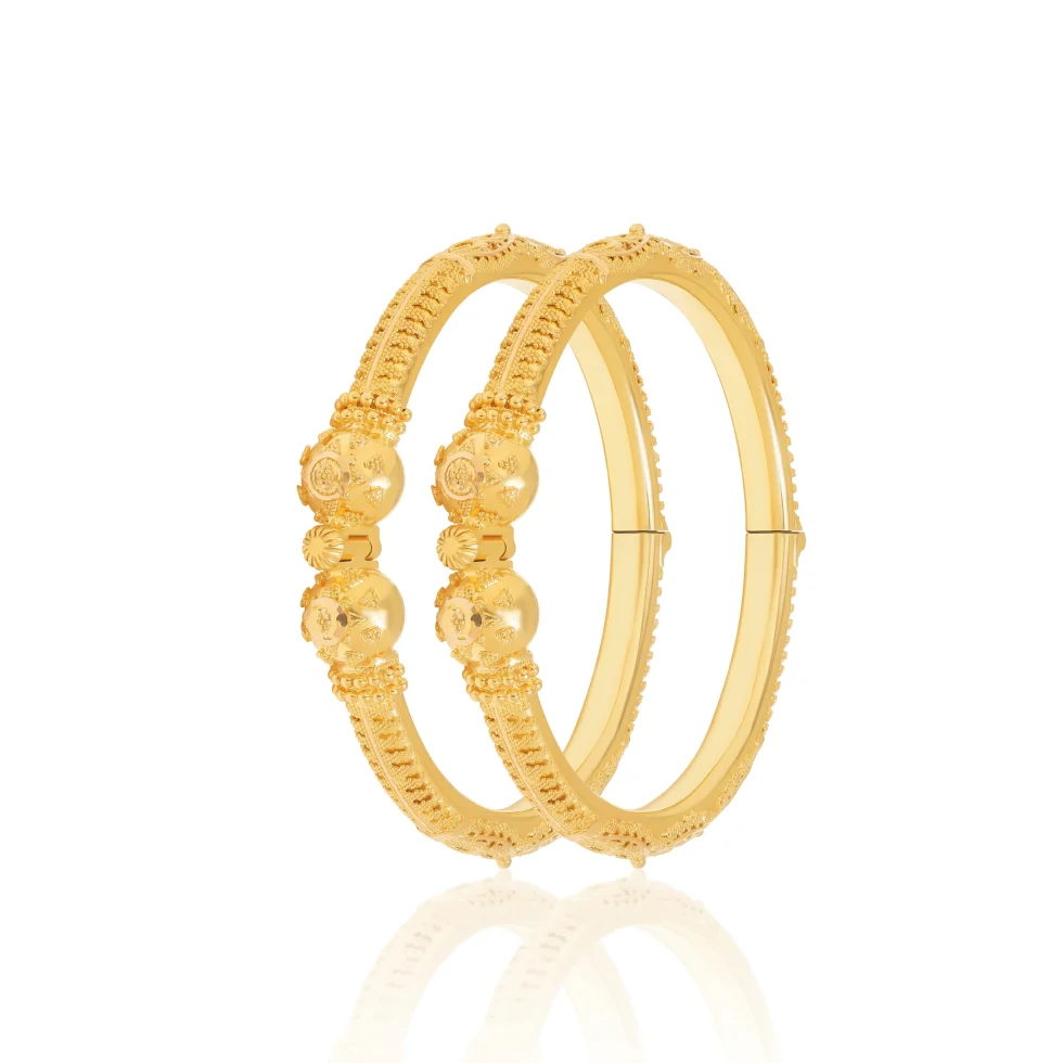 A beautifully balanced gold kara pair featuring smooth contours, subtle texturing, and graceful central accents. Designed for refined elegance, this pair offers a timeless look ideal for bridal and formal wear.