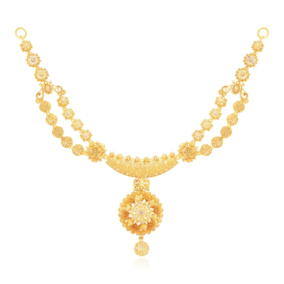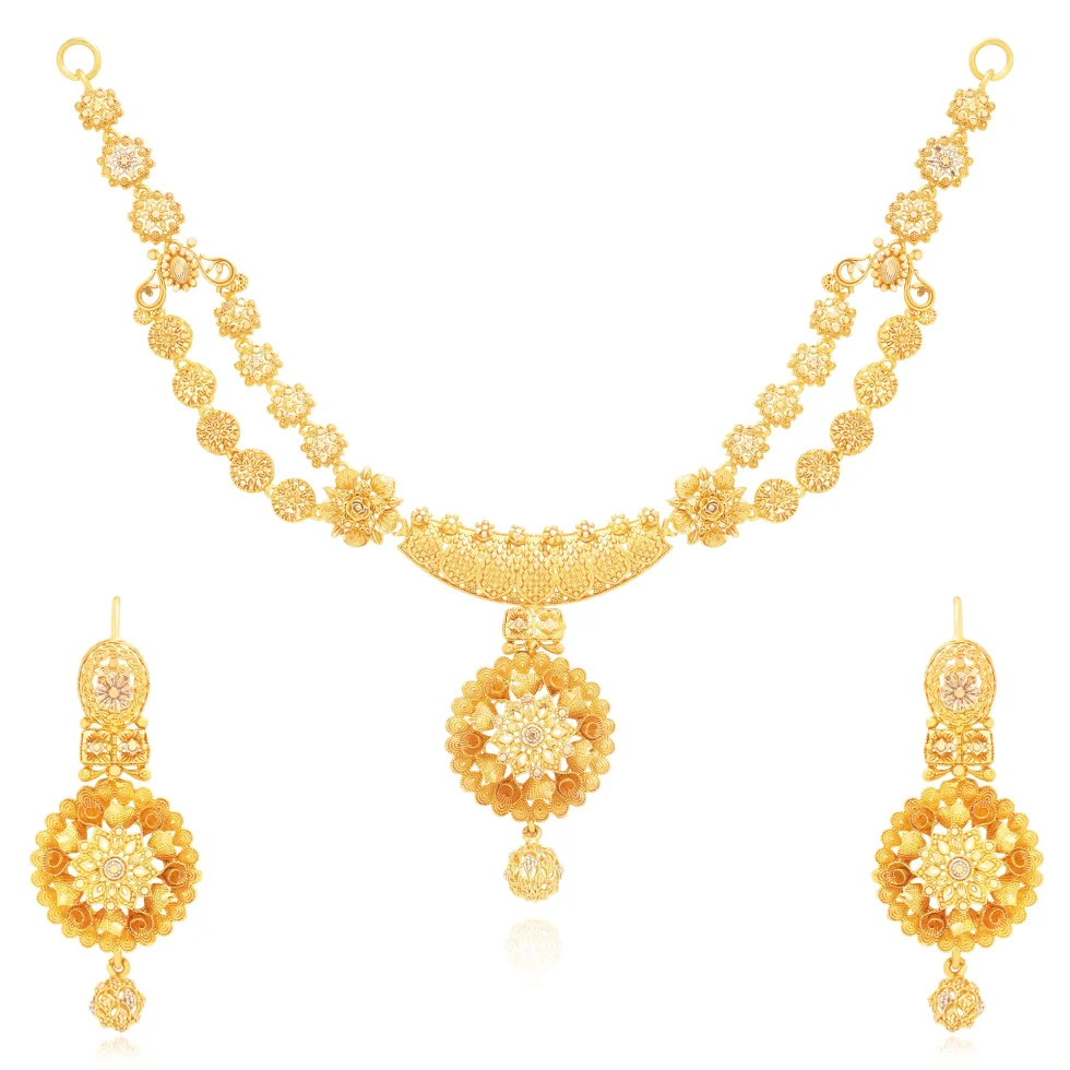 Designed to reflect classic grandeur, this necklace set features ornamental gold motifs arranged with precision. The bold pendant and matching earrings offer a stately presence ideal for ceremonial occasions.