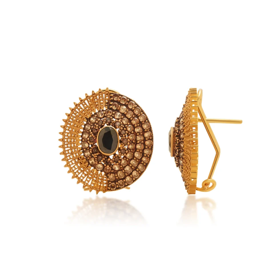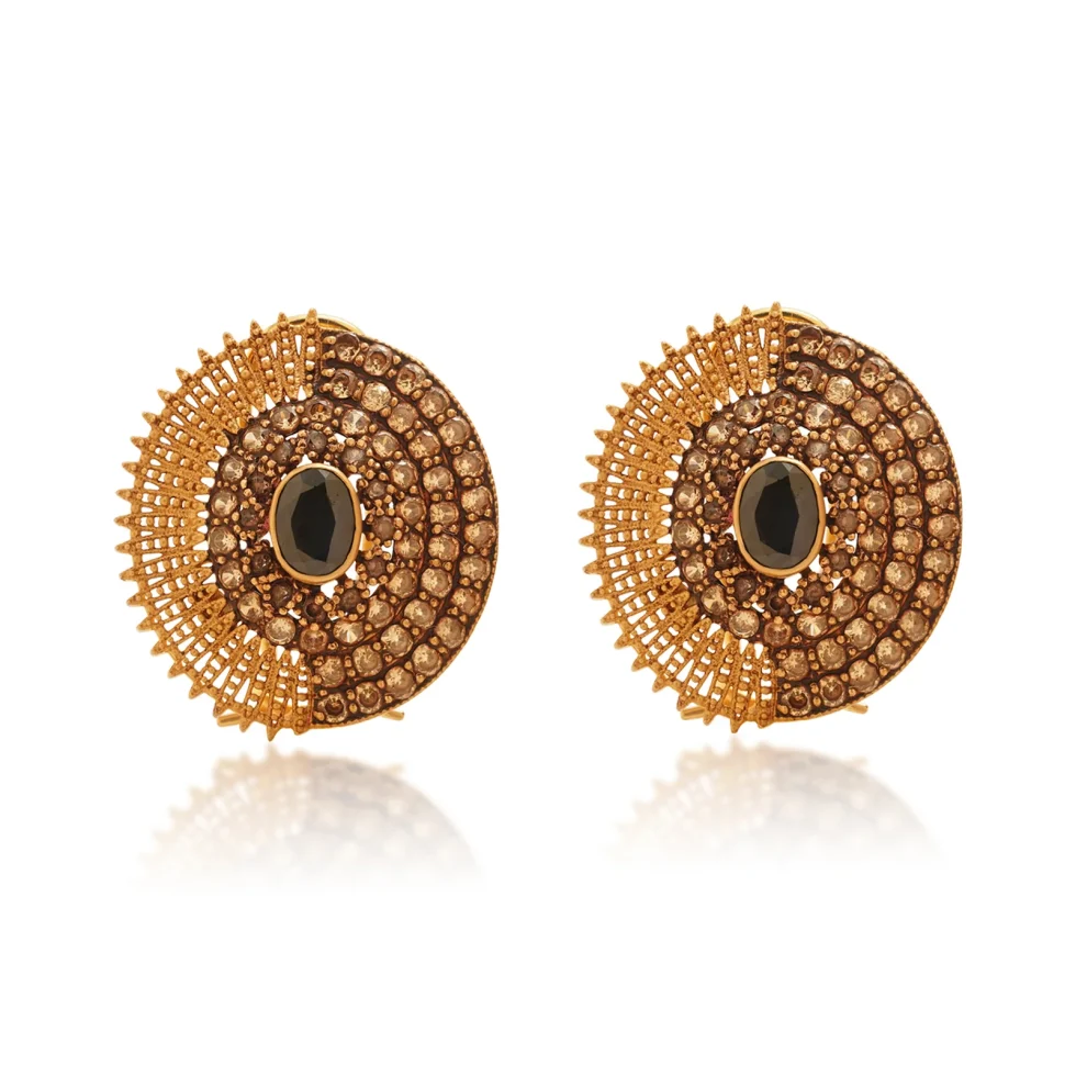 A striking blend of antique gold detailing and modern contrast, these circular tops feature concentric layers of textured stones that draw the eye inward to a bold noir centerpiece. The half-sunburst lattice adds dimension and artistry, creating a rich interplay of shadows and sparkle.