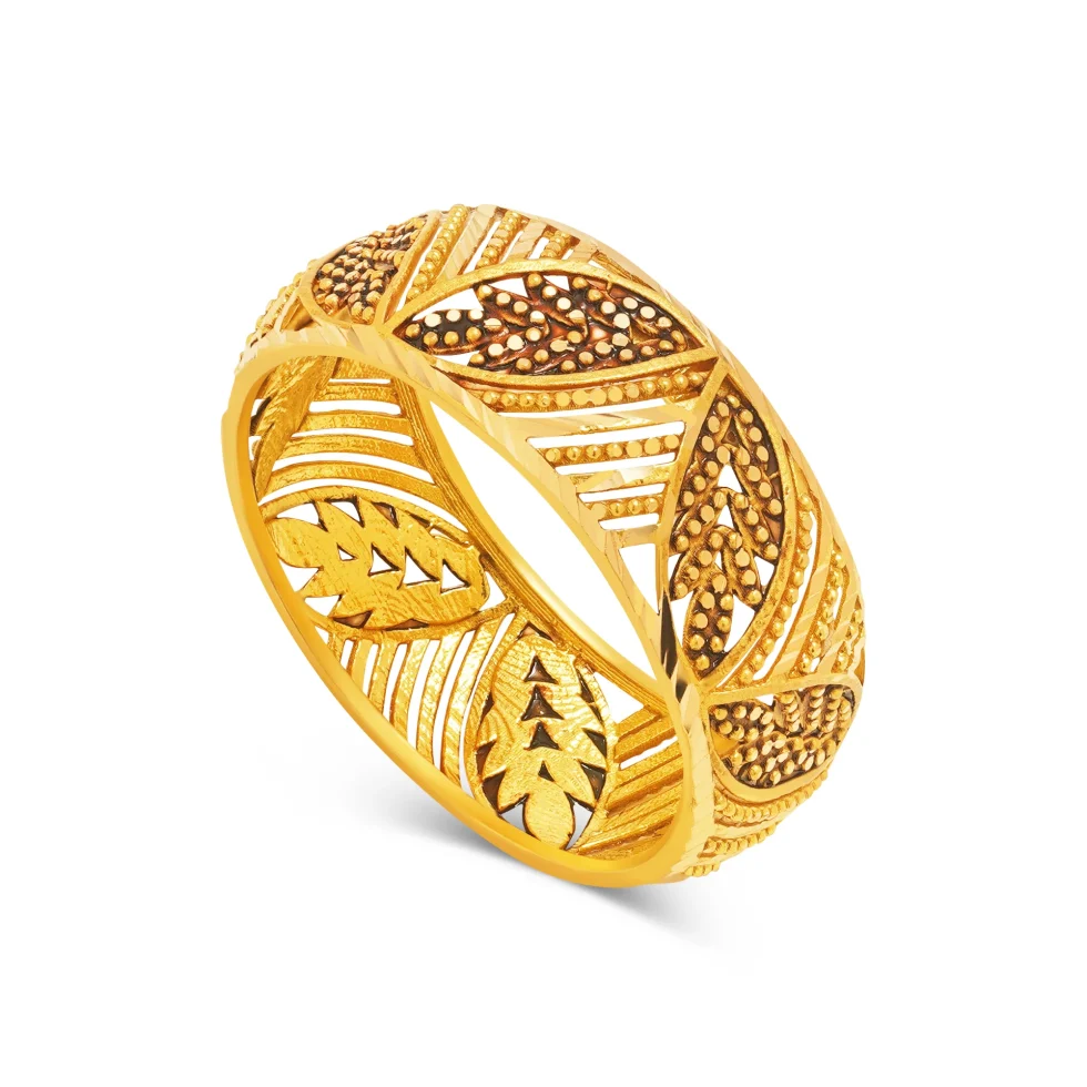 The ring showcases sculpted fern-like silhouettes intertwined with textured granules and antique highlights. This blend of organic shapes and rich shading brings dimension and character to the design, making it a standout for everyday elegance.