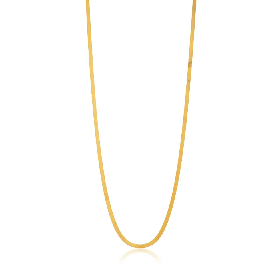 Crafted in a refined flat-link structure, this chain drapes beautifully along the neckline, offering a modern, polished look. Lightweight yet striking, it complements both minimalist and statement styling.