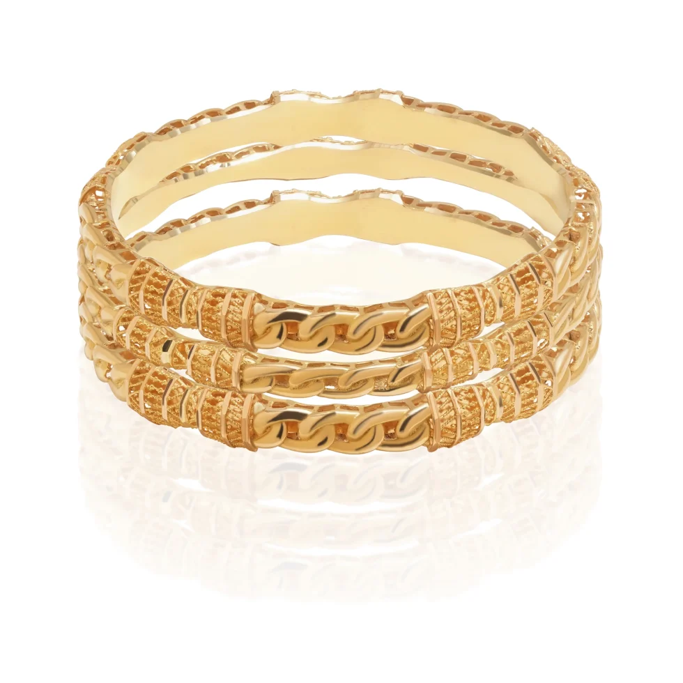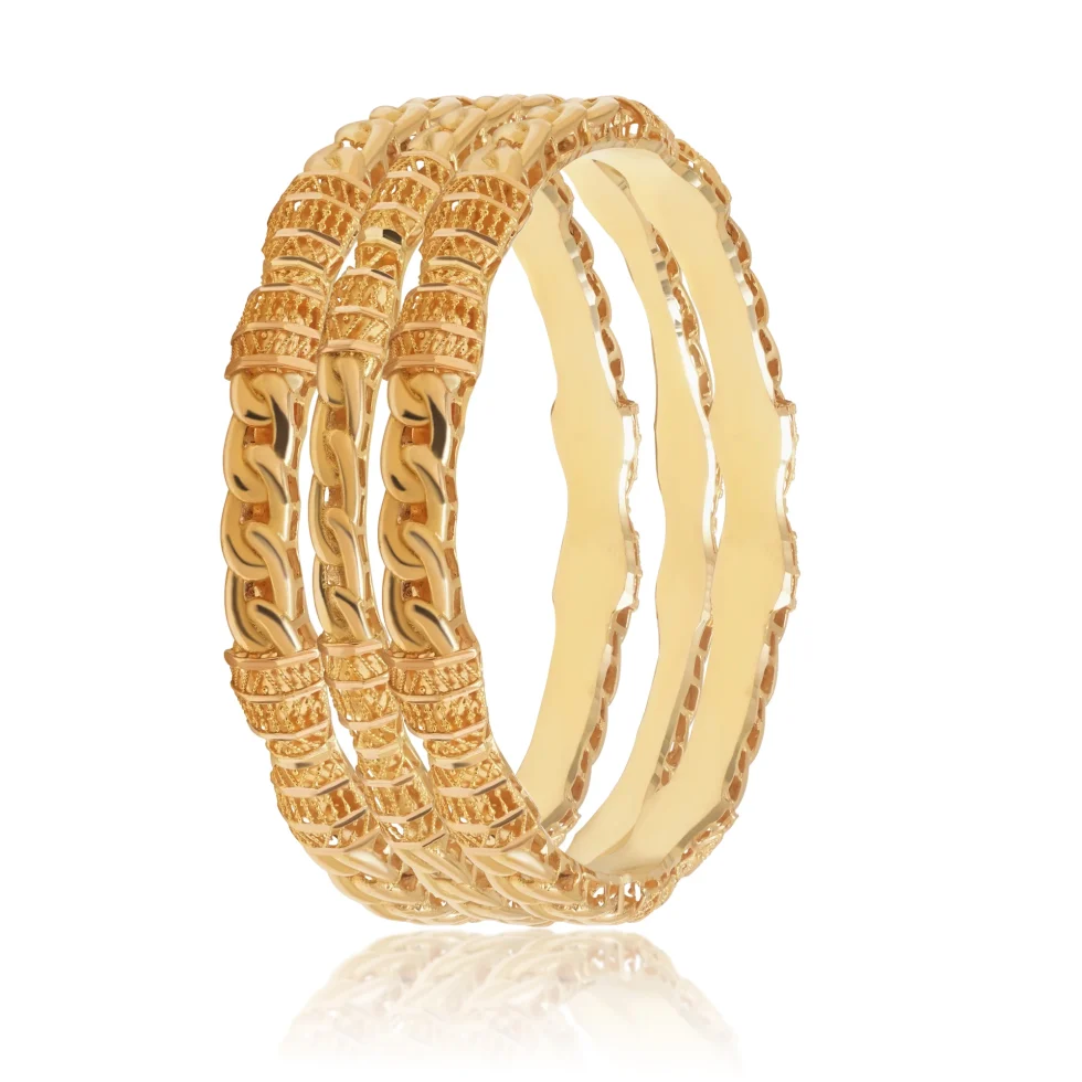 Featuring a harmonious blend of smooth gold surfaces and intricate accents, these bangles exude quiet elegance. A classic choice designed to be worn effortlessly, season after season.