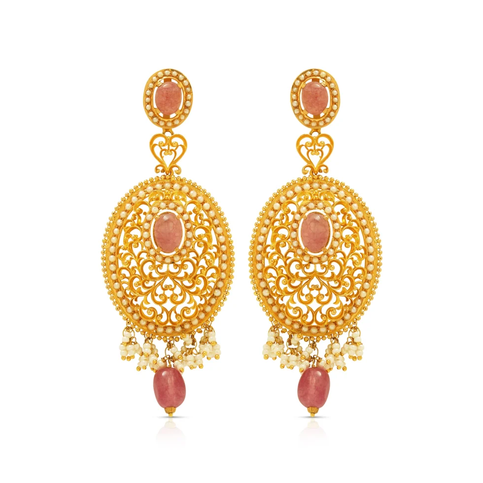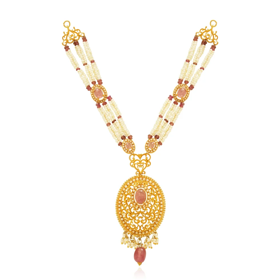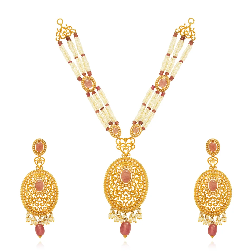 Crafted as an ode to vintage artistry, the Golden Heirloom Set features ornamental gold filigree centered around rose-toned gems. The layered pearls add a soft, regal balance making it a treasured piece of heritage and grace.