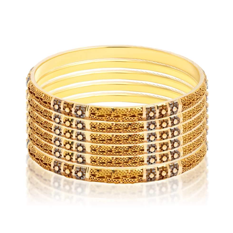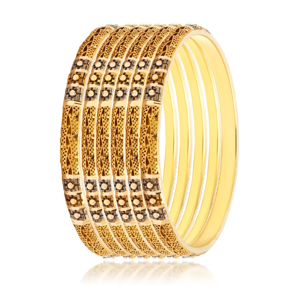 Intricately crafted with a lattice-like gold pattern, the Royal Weave Bangles embody regal charm and sophistication. Their detailed engraving and warm golden hue make them a perfect blend of tradition and grace ideal for festive and timeless wear.