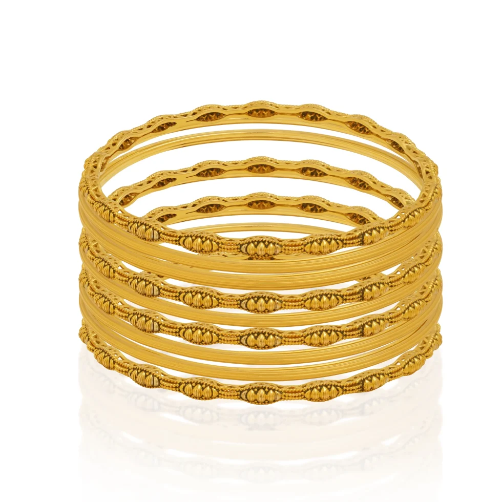 The gently curved silhouette paired with detailed bead-like textures gives these bangles a fluid, graceful character. Their lightweight finish ensures comfortable wear, while the subtle shine enhances every movement.