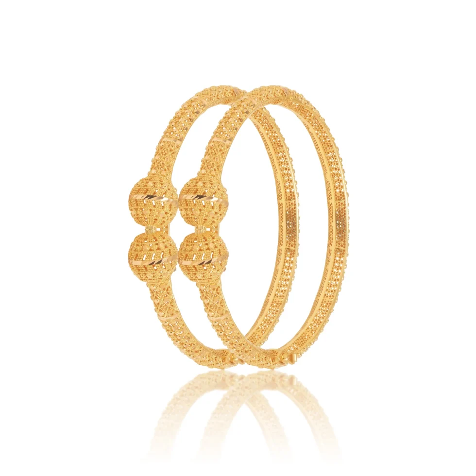 A sophisticated kara pair featuring intricately carved spherical motifs and finely textured detailing throughout. Its symmetrical design and rich craftsmanship create a timeless, heritage-inspired elegance.