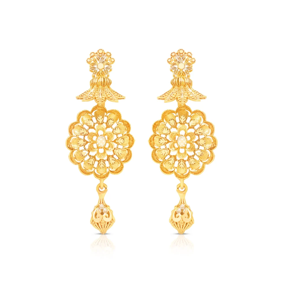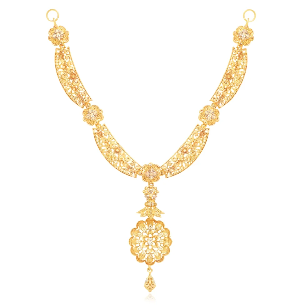 Inspired by classic floral patterns, this necklace set blends delicate filigree work with rich gold textures. The central pendant and matching earrings create a balanced silhouette, perfect for bridal wear and festive occasions.