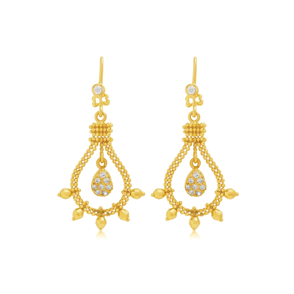 The ornate beaded pattern creates a rich, traditional silhouette, highlighted by a central stone-studded teardrop. Finished with small gold danglers for subtle motion, these earrings exude timeless cultural charm.